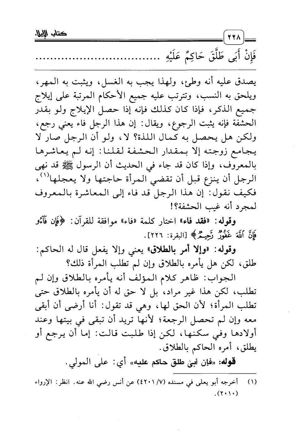 يصدق عليه أنه وطئ، ولهذا يجب به الغسل، ويثبت به المهر، ويلحق به النسب، وتترتب عليه جميع الأحكام المرتبة على إيلاج جميع الذكر، فإذا كان كذلك فإنه إذا حصل الإيلاج ولو بقدر الحشفة فإنه يثبت الرجوع، ويقال: إن هذا الرجل فاء يعني رجع، ولكن هل يحصل به كمال اللذة؟ لا، ولو أن الرجل صار لا يجامع زوجته إلا بمقدار الحشفة لقلنا: إنه لم يعاشرها بالمعروف، وإذا كان قد جاء في الحديث أن الرسول صلّى الله عليه وسلّم قد نهى الرجل أن ينزع قبل أن تقضي المرأة حاجتها ولا يعجلها (¬1)، فكيف نقول: إن هذا الرجل قد فاء إلى المعاشرة بالمعروف لمجرد أنه غيب الحشفة؟!
