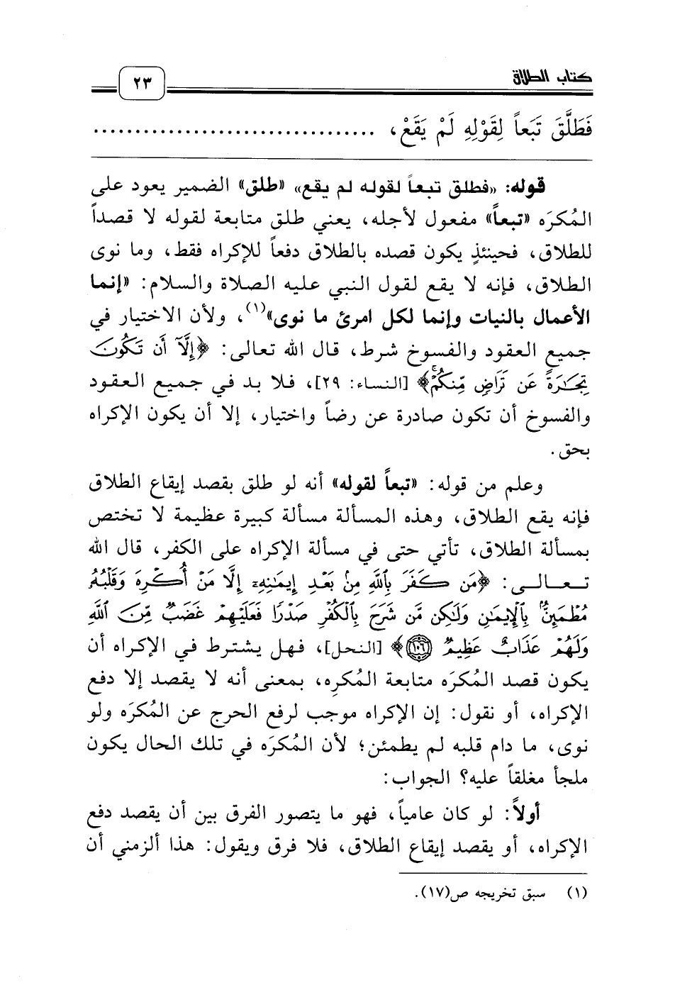 قوله: «فطلق تبعاً لقوله لم يقع» «طلق» الضمير يعود على المُكرَه «تبعاً» مفعول لأجله، يعني طلق متابعة لقوله لا قصداً للطلاق، فحينئذٍ يكون قصده بالطلاق دفعاً للإكراه فقط، وما نوى الطلاق، فإنه لا يقع لقول النبي عليه الصلاة والسلام: «إنما الأعمال بالنيات وإنما لكل امرئ ما نوى» (¬1)، ولأن الاختيار في جميع العقود والفسوخ شرط، قال الله تعالى: {إِلاَّ أَنْ تَكُونَ تِجَارَةً عَنْ تَرَاضٍ مِنْكُمْ} [النساء: 29]، فلا بد في جميع العقود والفسوخ أن تكون صادرة عن رضاً واختيار، إلا أن يكون الإكراه بحق.