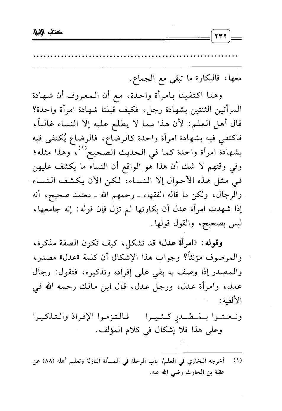 وقوله: «امرأة عدل» قد تشكل، كيف تكون الصفة مذكرة، والموصوف مؤنثاً؟ وجواب هذا الإشكال أن كلمة «عدل» مصدر، والمصدر إذا وصف به بقي على إفراده وتذكيره، فتقول: رجال عدل، وامرأة عدل، ورجل عدل، قال ابن مالك رحمه الله في الألفية: