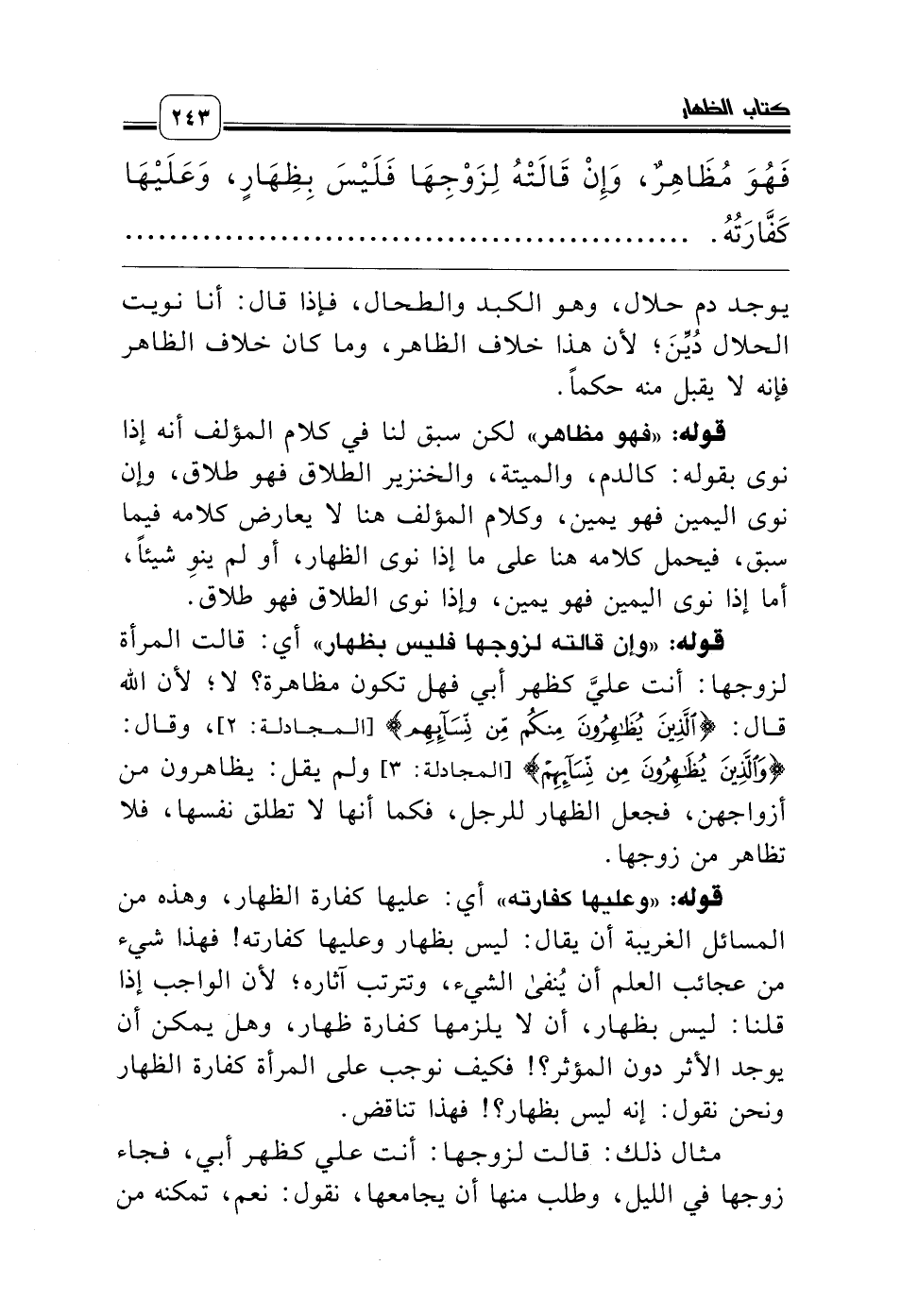 قوله: «وعليها كفارته» أي: عليها كفارة الظهار، وهذه من المسائل الغريبة أن يقال: ليس بظهار وعليها كفارته! فهذا شيء من عجائب العلم أن يُنفى الشيء، وتترتب آثاره؛ لأن الواجب إذا قلنا: ليس بظهار، أن لا يلزمها كفارة ظهار، وهل يمكن أن يوجد الأثر دون المؤثر؟! فكيف نوجب على المرأة كفارة الظهار ونحن نقول: إنه ليس بظهار؟! فهذا تناقض.