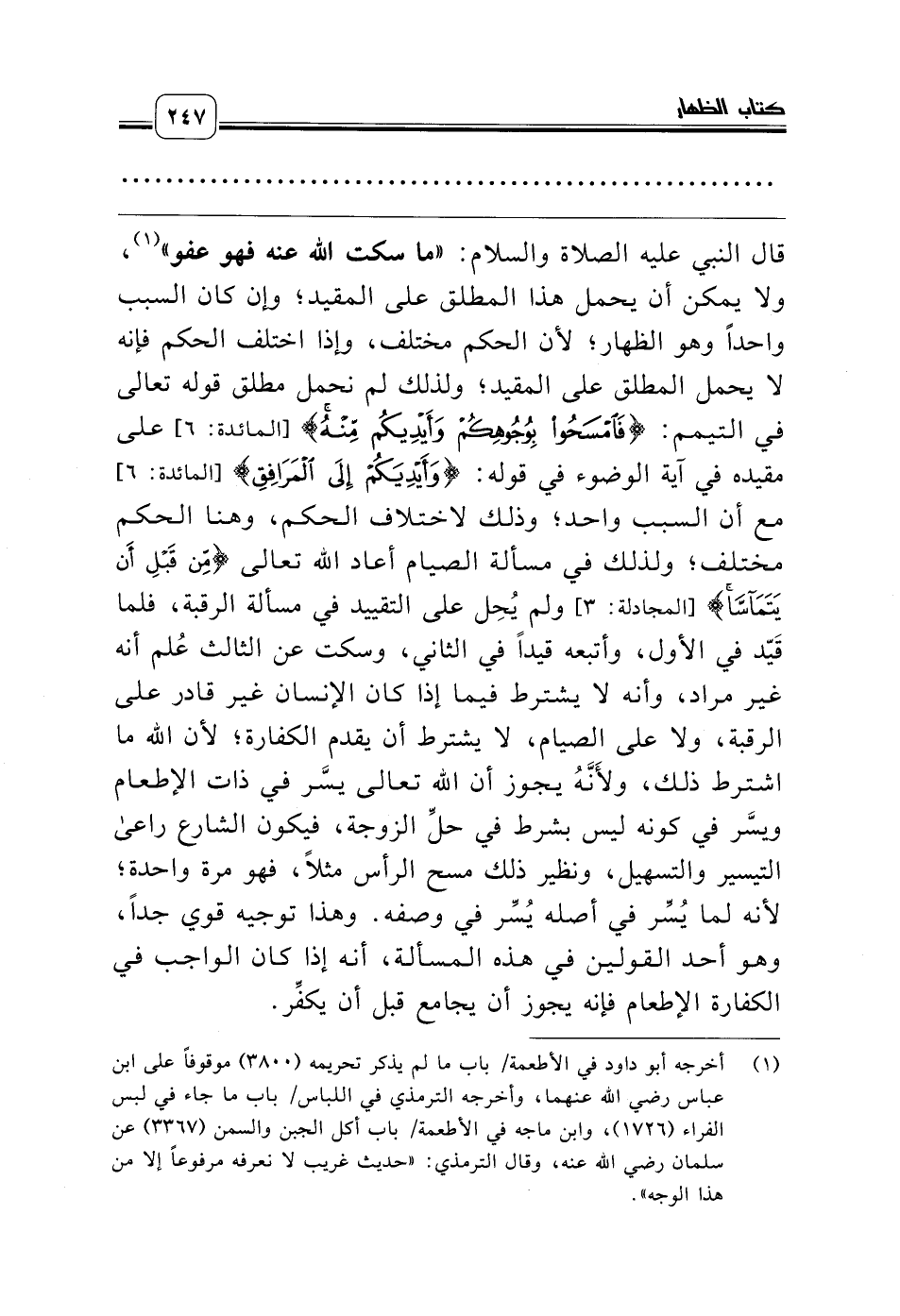 قال النبي عليه الصلاة والسلام: «ما سكت الله عنه فهو عفو» (¬1)، ولا يمكن أن يحمل هذا المطلق على المقيد؛ وإن كان السبب واحداً وهو الظهار؛ لأن الحكم مختلف، وإذا اختلف الحكم فإنه لا يحمل المطلق على المقيد؛ ولذلك لم نحمل مطلق قوله تعالى في التيمم: {فَامْسَحُوا بِوُجُوهِكُمْ وَأَيْدِيكُمْ مِنْهُ} [المائدة: 6] على مقيده في آية الوضوء في قوله: {وَأَيْدِيَكُمْ إِلَى الْمَرَافِقِ} [المائدة: 6] مع أن السبب واحد؛ وذلك لاختلاف الحكم، وهنا الحكم مختلف؛ ولذلك في مسألة الصيام أعاد الله تعالى {مِنْ قَبْلِ أَنْ يَتَمَآسَّا} [المجادلة: 3] ولم يُحِل على التقييد في مسألة الرقبة، فلما قَيّد في الأول، وأتبعه قيداً في الثاني، وسكت عن الثالث عُلم أنه غير مراد، وأنه لا يشترط فيما إذا كان الإنسان غير قادر على الرقبة، ولا على الصيام، لا يشترط أن يقدم الكفارة؛ لأن الله ما اشترط ذلك، ولأَنَّهُ يجوز أن الله تعالى يسَّر في ذات الإطعام ويسَّر في كونه ليس بشرط في حلِّ الزوجة، فيكون الشارع راعى التيسير والتسهيل، ونظير ذلك مسح الرأس مثلاً، فهو مرة واحدة؛ لأنه لما يُسِّر في أصله يُسِّر في وصفه. وهذا توجيه قوي جداً، وهو أحد القولين في هذه المسألة، أنه إذا كان الواجب في الكفارة الإطعام فإنه يجوز أن يجامع قبل أن يكفِّر.