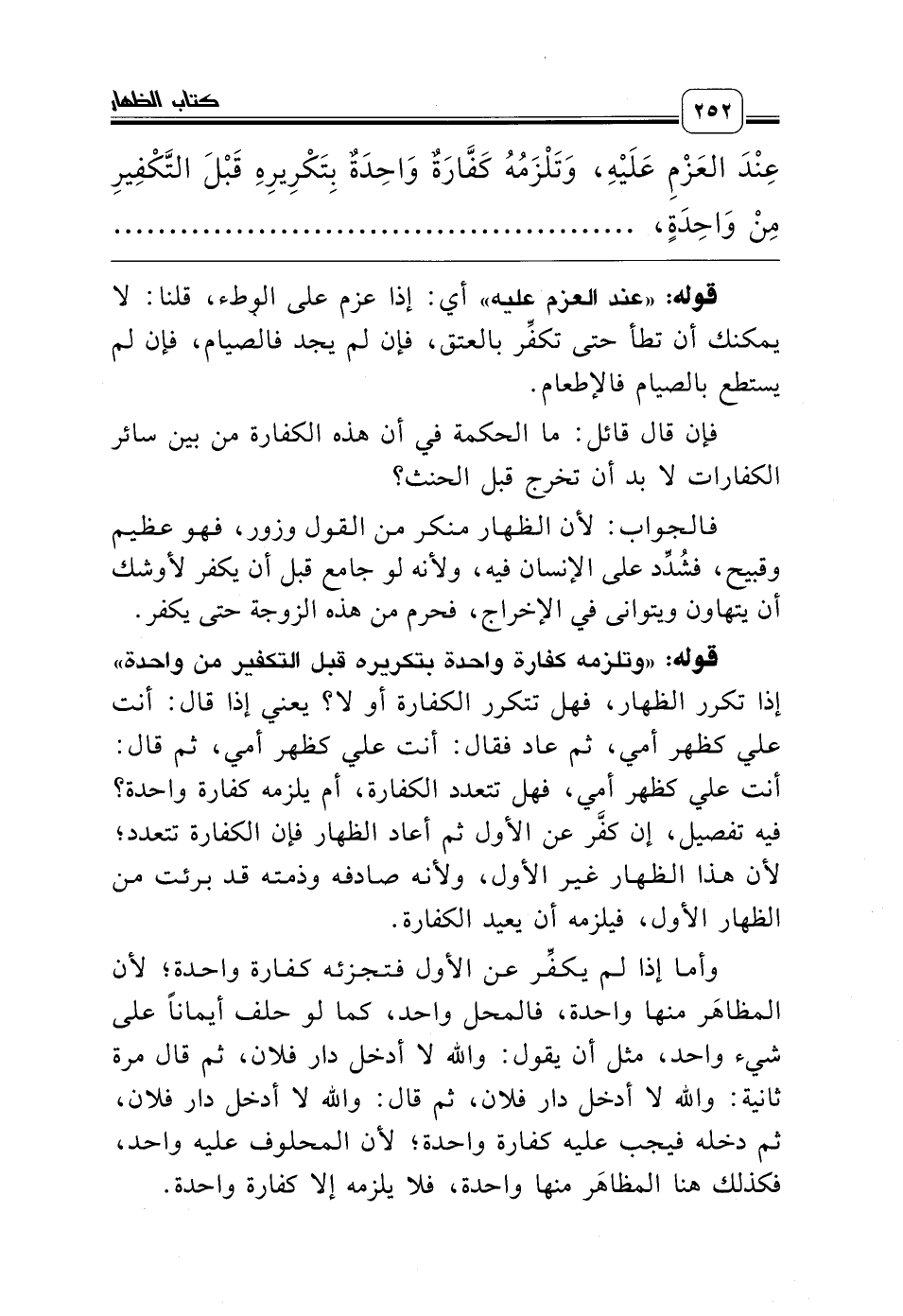 وأما إذا لم يكفِّر عن الأول فتجزئه كفارة واحدة؛ لأن المظاهَر منها واحدة، فالمحل واحد، كما لو حلف أيماناً على شيء واحد، مثل أن يقول: والله لا أدخل دار فلان، ثم قال مرة ثانية: والله لا أدخل دار فلان، ثم قال: والله لا أدخل دار فلان، ثم دخله فيجب عليه كفارة واحدة؛ لأن المحلوف عليه واحد، فكذلك هنا المظاهَر منها واحدة، فلا يلزمه إلا كفارة واحدة.