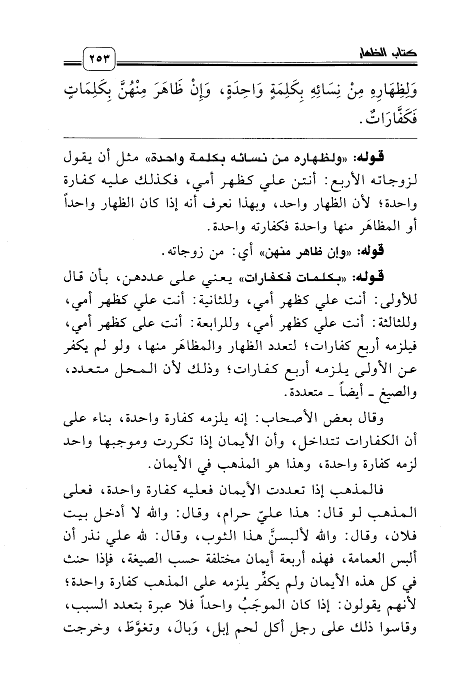 قوله: «بكلمات فكفارات» يعني على عددهن، بأن قال للأولى: أنت علي كظهر أمي، وللثانية: أنت علي كظهر أمي، وللثالثة: أنت علي كظهر أمي، وللرابعة: أنت على كظهر أمي، فيلزمه أربع كفارات؛ لتعدد الظهار والمظاهَر منها، ولو لم يكفر عن الأولى يلزمه أربع كفارات؛ وذلك لأن المحل متعدد، والصيغ ـ أيضاً ـ متعددة.
