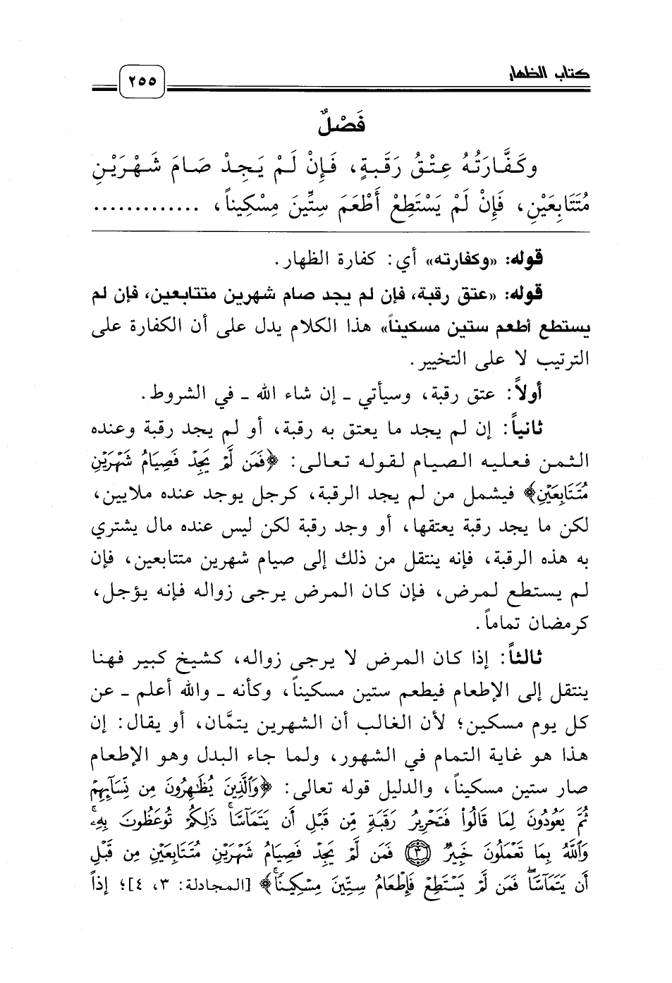 ثالثاً: إذا كان المرض لا يرجى زواله، كشيخ كبير فهنا ينتقل إلى الإطعام فيطعم ستين مسكيناً، وكأنه ـ والله أعلم ـ عن كل يوم مسكين؛ لأن الغالب أن الشهرين يتمَّان، أو يقال: إن هذا هو غاية التمام في الشهور، ولما جاء البدل وهو الإطعام صار ستين مسكيناً، والدليل قوله تعالى: {وَالَّذِينَ يُظَاهِرُونَ مِنْ نِسَائِهِمْ ثُمَّ يَعُودُونَ لِمَا قَالُوا فَتَحْرِيرُ رَقَبَةٍ مِنْ قَبْلِ أَنْ يَتَمَآسَّا ذَلِكُمْ تُوعَظُونَ بِهِ وَاللَّهُ بِمَا تَعْمَلُونَ خَبِيرٌ *} {فَمَنْ لَمْ يَجِدْ فَصِيَامُ شَهْرَيْنِ مُتَتَابِعَيْنِ مِنْ قَبْلِ أَنْ يَتَمَآسَّا فَمَنْ لَمْ يَسْتَطِعْ فَإِطْعَامُ سِتِّينَ مِسْكِيناً} [المجادلة: 3، 4]؛ إذاً