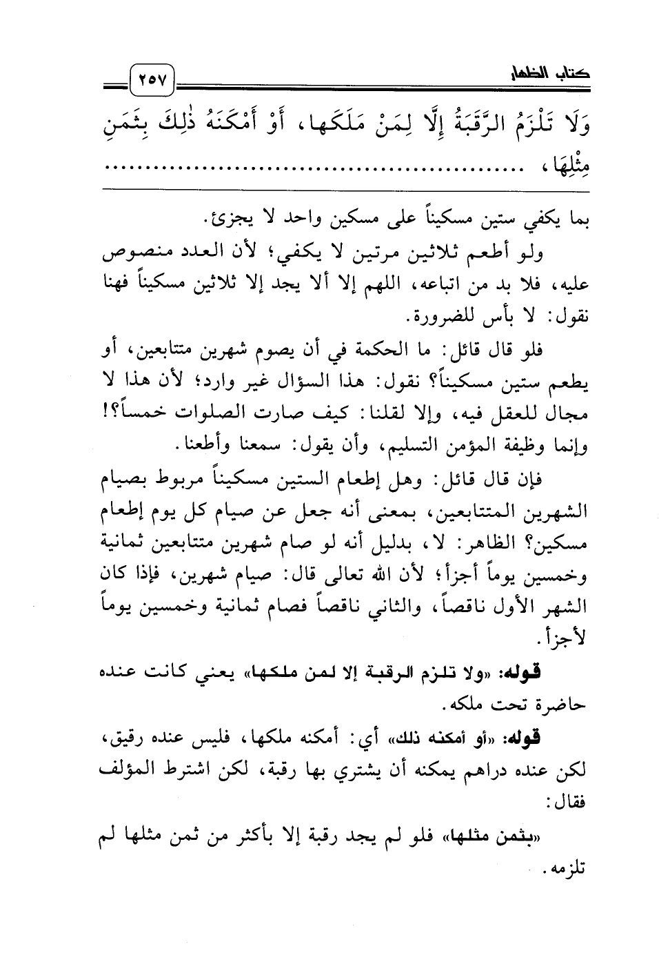 وَلاَ تَلْزَمُ الرَّقَبَةُ إِلاَّ لِمَنْ مَلَكَها، أَوْ أَمْكَنَهُ ذلِكَ بِثَمَنِ مِثْلِهَا، فَاضِلاً عَنْ كِفَايَتِهِ دَائِماً، وَكِفَايَةِ مَنْ يَمُونُهُ، وَعَمَّا يَحْتَاجُهُ مِنْ مَسْكَنٍ وَخَادِمٍ وَمَرْكُوبٍ، ........................
