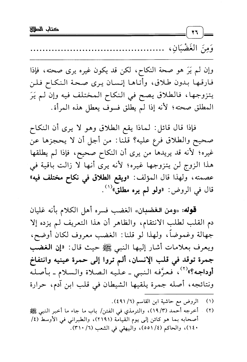 قوله: «ومن الغضبان» الغضب فسره أهل الكلام بأنه غليان دم القلب لطلب الانتقام، والظاهر أن هذا التعريف لم يزده إلا جهالة وغموضاً، ولهذا لو قلنا: الغضب معروف لكان أوضح، ويعرف بعلامات أشار إليها النبي صلّى الله عليه وسلّم حيث قال: «إن الغضب جمرة توقد في قلب الإنسان، ألم تروا إلى حمرة عينيه وانتفاخ أوداجه؟» (¬2)، فعرَّفه النبي ـ عليه الصلاة والسلام ـ بأصله ونتائجه، أصله جمرة يلقيها الشيطان في قلب ابن آدم، حرارة
