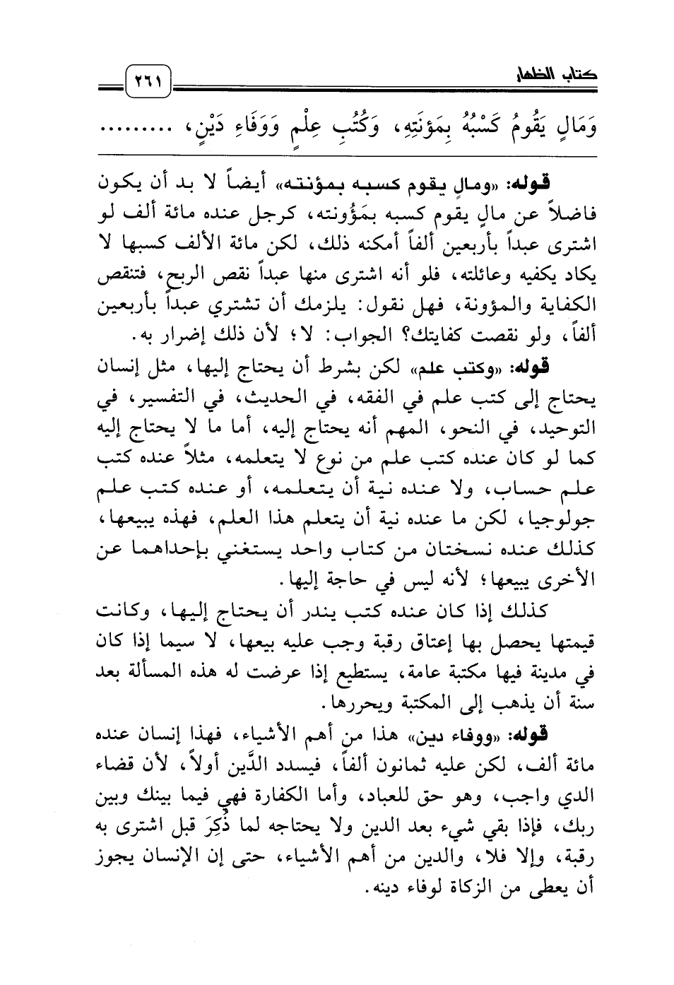 قوله: «ومالٍ يقوم كسبه بمؤنته» أيضاً لا بد أن يكون فاضلاً عن مالٍ يقوم كسبه بمَؤُونته، كرجل عنده مائة ألف لو اشترى عبداً بأربعين ألفاً أمكنه ذلك، لكن مائة الألف كسبها لا يكاد يكفيه وعائلته، فلو أنه اشترى منها عبداً نقص الربح، فتنقص الكفاية والمؤونة، فهل نقول: يلزمك أن تشتري عبداً بأربعين ألفاً، ولو نقصت كفايتك؟ الجواب: لا؛ لأن ذلك إضرار به.