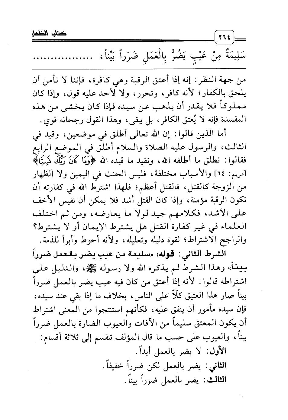 الشرط الثاني: قوله: «سليمة من عيب يضر بالعمل ضرراً بيناً» وهذا الشرط لم يذكره الله ولا رسوله صلّى الله عليه وسلّم، والدليل على اشتراطه قالوا: لأنه إذا أعتق من كان فيه عيب يضر بالعمل ضرراً بيناً صار هذا العتيق كلاًّ على الناس، بخلاف ما إذا بقي عند سيده، فإن سيده مأمور أن ينفق عليه، فكأنهم استنتجوا من المعنى اشتراط أن يكون المعتق سليماً من الآفات والعيوب الضارة بالعمل ضرراً بيناً، والعيوب على حسب ما قال المؤلف تنقسم إلى ثلاثة أقسام: