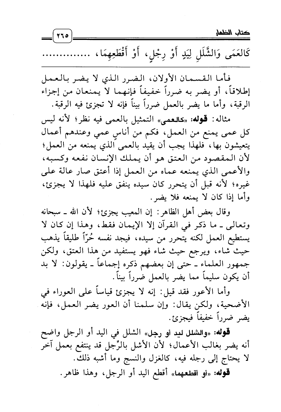 فأما القسمان الأولان، الضرر الذي لا يضر بالعمل إطلاقاً، أو يضر به ضرراً خفيفاً فإنهما لا يمنعان من إجزاء الرقبة، وأما ما يضر بالعمل ضرراً بيناً فإنه لا تجزئ فيه الرقبة.