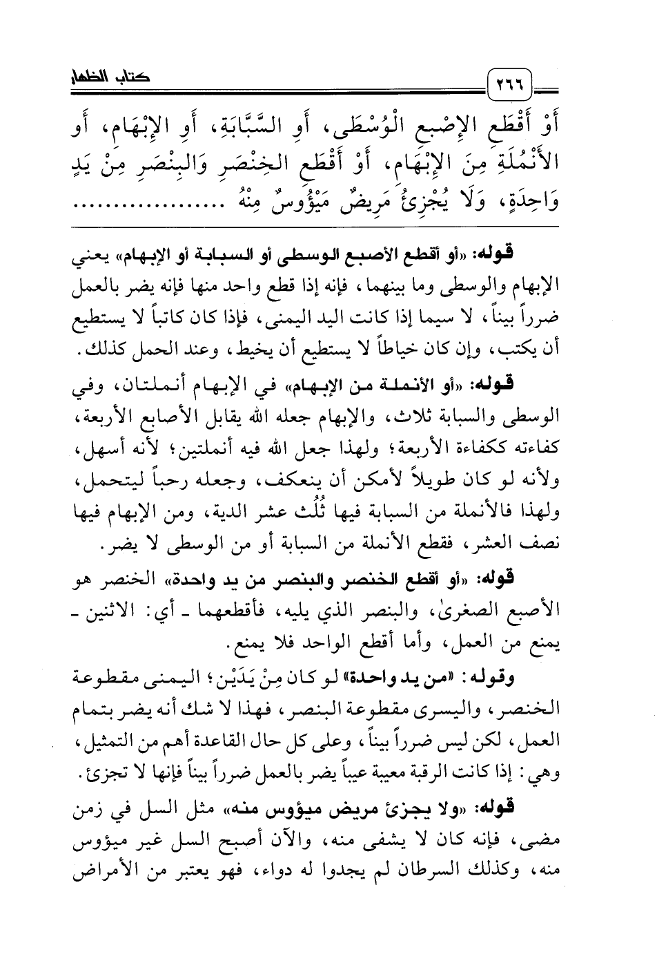 قوله: «أو أقطع الأصبع الوسطى أو السبابة أو الإبهام» يعني الإبهام والوسطى وما بينهما، فإنه إذا قطع واحد منها فإنه يضر بالعمل ضرراً بيناً، لا سيما إذا كانت اليد اليمنى، فإذا كان كاتباً لا يستطيع أن يكتب، وإن كان خياطاً لا يستطيع أن يخيط، وعند الحمل كذلك.