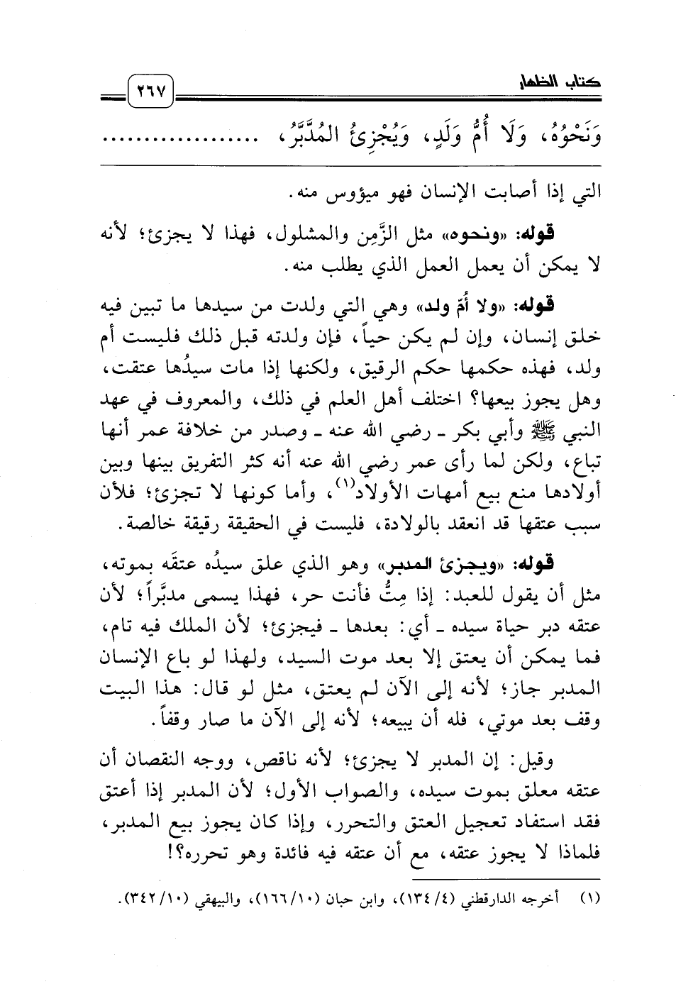 قوله: «ولا أُمّ ولد» وهي التي ولدت من سيدها ما تبين فيه خلق إنسان، وإن لم يكن حياً، فإن ولدته قبل ذلك فليست أم ولد، فهذه حكمها حكم الرقيق، ولكنها إذا مات سيدُها عتقت، وهل يجوز بيعها؟ اختلف أهل العلم في ذلك، والمعروف في عهد النبي صلّى الله عليه وسلّم وأبي بكر ـ رضي الله عنه ـ وصدر من خلافة عمر أنها تباع، ولكن لما رأى عمر رضي الله عنه أنه كثر التفريق بينها وبين أولادها منع بيع أمهات الأولاد (¬1)، وأما كونها لا تجزئ؛ فلأن سبب عتقها قد انعقد بالولادة، فليست في الحقيقة رقيقة خالصة.