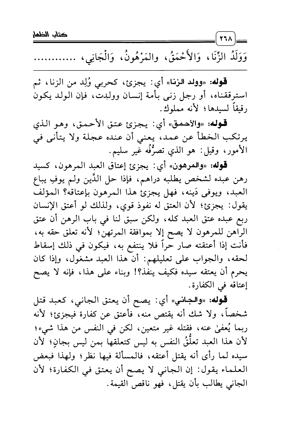 قوله: «والجاني» أي: يصح أن يعتق الجاني، كعبد قتل شخصاً، ولا شك أنه يقتص منه، فأعتق عن كفارة فيجزئ؛ لأنه ربما يُعفى عنه، فقتله غير متعين، لكن في النفس من هذا شيء؛ لأن هذا العبد تعلُّقُ النفس به ليس كتعلقها بمن ليس بجانٍ؛ لأن سيده لما رأى أنه يقتل أعتقه، فالمسألة فيها نظر؛ ولهذا فبعض العلماء يقول: إن الجاني لا يصح أن يعتق في الكفارة؛ لأن الجاني يطالب بأن يقتل، فهو ناقص القيمة.