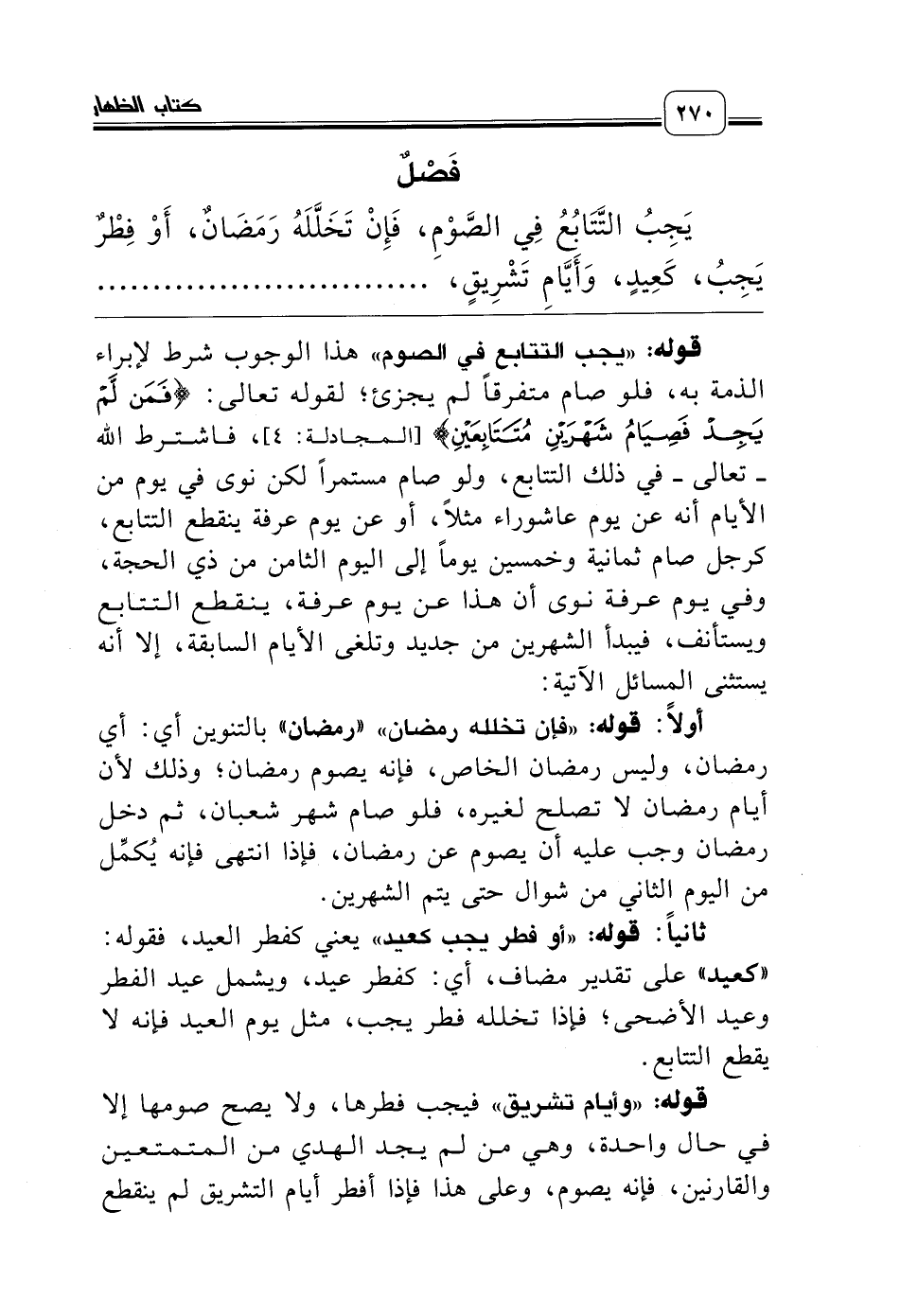يَجِبُ التَّتَابُعُ فِي الصَّوْمِ، فَإِنْ تَخَلَّلَهُ رَمَضَانٌ، أَوْ فِطْرٌ يَجِبُ، كَعِيدٍ، وَأَيَّامِ تَشْرِيقٍ، وَحَيْضٍ، وَجُنُونٍ، .......................