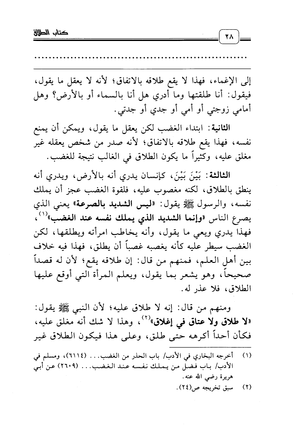 الثالثة: بَيْنَ بَيْنَ، كإنسان يدري أنه بالأرض ويدري أنه ينطق بالطلاق، لكنه مغصوب عليه، فلقوة الغضب عجز أن يملك نفسه، والرسول صلّى الله عليه وسلّم يقول: «ليس الشديد بالصرعة» يعني الذي يصرع الناس «وإنما الشديد الذي يملك نفسه عند الغضب» (¬1)، فهذا يدري ويعي ما يقول، وأنه يخاطب امرأته ويطلقها، لكن الغضب سيطر عليه كأنه يغصبه غصباً أن يطلق، فهذا فيه خلاف بين أهل العلم، فمنهم من قال: إن طلاقه يقع؛ لأن له قصداً صحيحاً، وهو يشعر بما يقول، ويعلم المرأة التي أوقع عليها الطلاق، فلا عذر له.