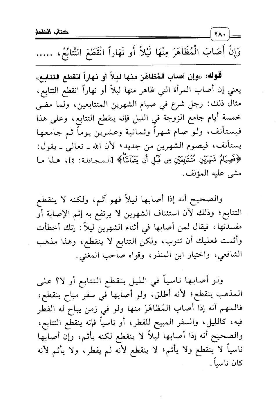 قوله: «وإن أصاب المُظاهَرَ منها ليلاً أو نهاراً انقطع التتابع» يعني إن أصاب المرأة التي ظاهر منها ليلاً أو نهاراً انقطع التتابع، مثال ذلك: رجل شرع في صيام الشهرين المتتابعين، ولما مضى خمسة أيام جامع الزوجة في الليل فإنه ينقطع التتابع، وعلى هذا فيستأنف، ولو صام شهراً وثمانية وعشرين يوماً ثم جامعها يستأنف، فيصوم الشهرين من جديد؛ لأن الله ـ تعالى ـ يقول: {فَصِيَامُ شَهْرَيْنِ مُتَتَابِعَيْنِ مِنْ قَبْلِ أَنْ يَتَمَآسَّا} [المجادلة: 4]، هذا ما مشى عليه المؤلف.