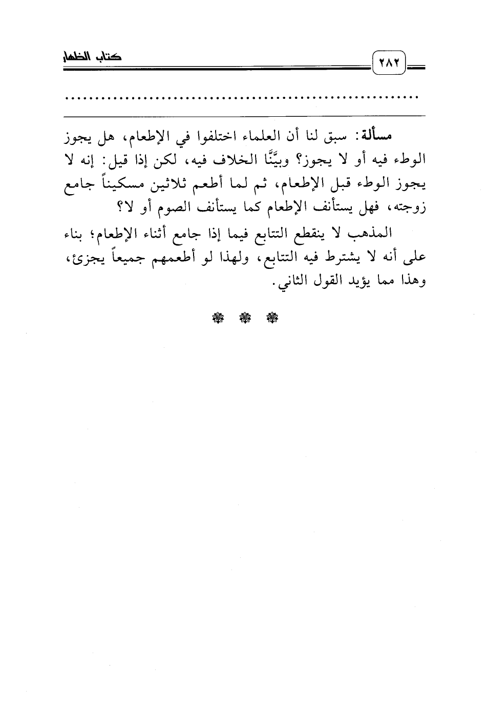 مسألة: سبق لنا أن العلماء اختلفوا في الإطعام، هل يجوز الوطء فيه أو لا يجوز؟ وبيَّنَّا الخلاف فيه، لكن إذا قيل: إنه لا يجوز الوطء قبل الإطعام، ثم لما أطعم ثلاثين مسكيناً جامع زوجته، فهل يستأنف الإطعام كما يستأنف الصوم أو لا؟