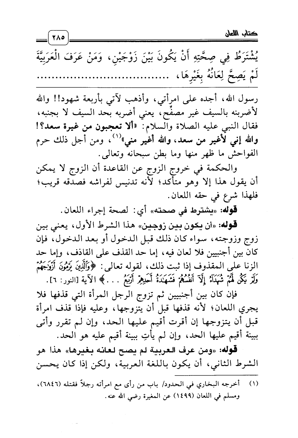 قوله: «أن يكون بين زوجين» هذا الشرط الأول، يعني بين زوج وزوجته، سواء كان ذلك قبل الدخول أو بعد الدخول، فإن كان بين أجنبيين فلا لعان فيه، إما حد القذف على القاذف، وإما حد الزنا على المقذوف إذا ثبت ذلك، لقوله تعالى: {وَالَّذِينَ يَرْمُونَ أَزْوَاجَهُمْ وَلَمْ يَكُنْ لَهُمْ شُهَدَاءُ إِلاَّ أَنْفُسُهُمْ فَشَهَادَةُ أَحَدِهِمْ أَرْبَعُ} ... } الآية [النور: 6].