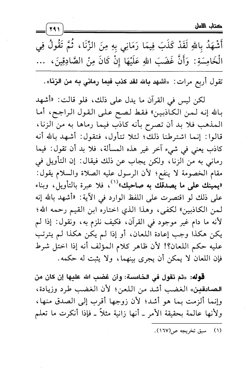 لكن ليس في القرآن ما يدل على ذلك، فلو قالت: «أشهد بالله إنه لمن الكاذبين» فقط لصح على القول الراجح، أما المذهب فلا بد أن تصرح بأنه كاذب فيما رماها به من الزنا، قالوا: إنما اشترطنا ذلك؛ لئلا تتأول، فتقول: أشهد بالله أنه كاذب يعني في شيء آخر غير هذه المسألة، فلا بد أن تقول: فيما رماني به من الزنا، ولكن يجاب عن ذلك فيقال: إن التأويل في مقام الخصومة لا ينفع؛ لأن الرسول عليه الصلاة والسلام يقول: «يمينك على ما يصدقك به صاحبك» (¬1)، فلا عبرة بالتأويل، وبناء على ذلك لو اقتصرت على اللفظ الوارد في الآية: «أشهد بالله إنه لمن الكاذبين» لكفى، وهذا الذي اختاره ابن القيم رحمه الله؛ لأنه ما دام غير موجود في القرآن، فكيف نلزم به، ونقول: إذا لم يكن هكذا وجب إعادة اللعان، أو إذا لم يكن هكذا لم يترتب عليه حكم اللعان؟! لأن ظاهر كلام المؤلف أنه إذا اختل شرط فإن اللعان لا يمكن أن يجرى بينهما، ولا يثبت له حكمه.