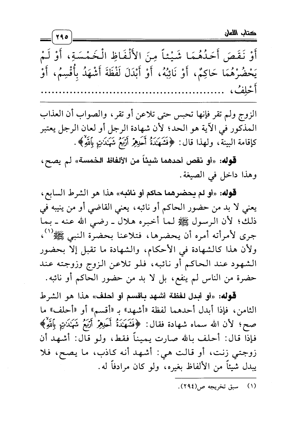 قوله: «أو لم يحضرهما حاكم أو نائبه» هذا هو الشرط السابع، يعني لا بد من حضور الحاكم أو نائبه، يعني القاضي أو من ينيبه في ذلك؛ لأن الرسول صلّى الله عليه وسلّم لما أخبره هلال ـ رضي الله عنه ـ بما جرى لأمرأته أمره أن يحضرها، فتلاعنا بحضرة النبي صلّى الله عليه وسلّم (¬1)، ولأن هذا كالشهادة في الأحكام، والشهادة ما تقبل إلا بحضور الشهود عند الحاكم أو نائبه، فلو تلاعن الزوج وزوجته عند حضرة من الناس لم ينفع، بل لا بد من حضور الحاكم أو نائبه.