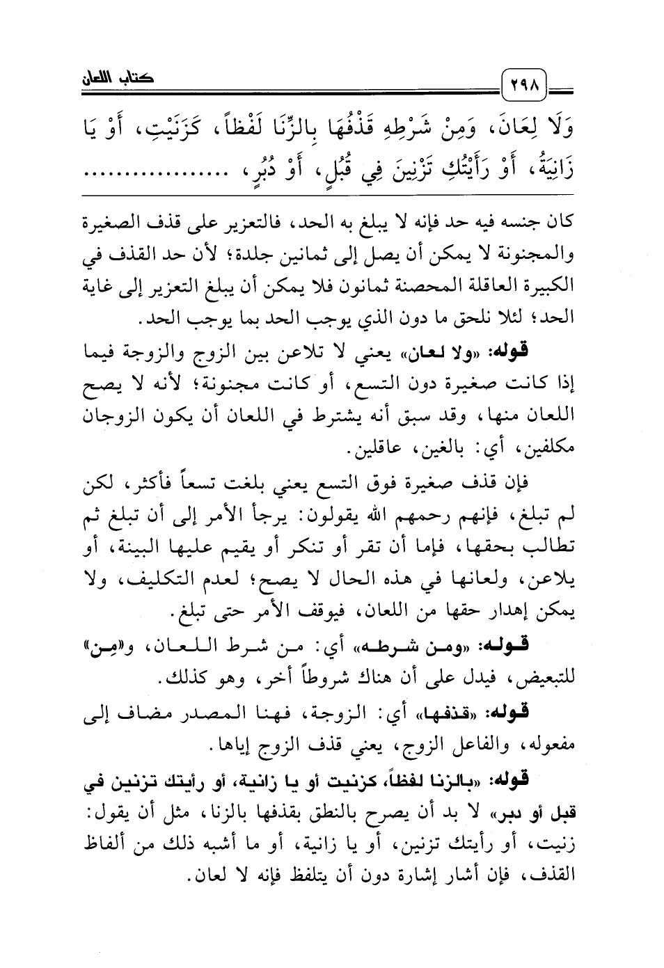 قوله: «بالزنا لفظاً، كزنيت أو يا زانية، أو رأيتك تزنين في قبل أو دبر» لا بد أن يصرح بالنطق بقذفها بالزنا، مثل أن يقول: زنيت، أو رأيتك تزنين، أو يا زانية، أو ما أشبه ذلك من ألفاظ القذف، فإن أشار إشارة دون أن يتلفظ فإنه لا لعان.