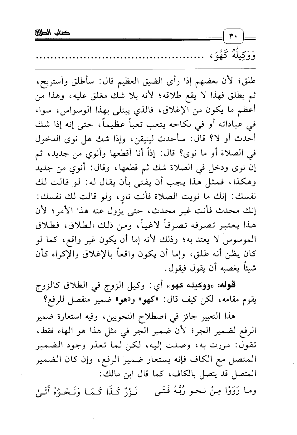 قوله: «ووكيله كهو» أي: وكيل الزوج في الطلاق كالزوج يقوم مقامه، لكن كيف قال: «كهو» و «هو» ضمير منفصل للرفع؟