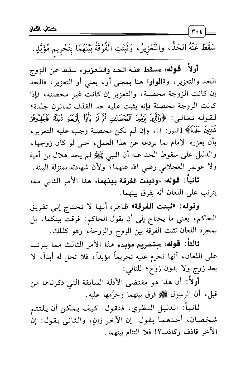 ثالثاً: قوله: «بتحريم مؤبد» هذا الأمر الثالث مما يترتب على اللعان، أنها تحرم عليه تحريماً مؤبداً، فلا تحل له أبداً، لا بعد زوج ولا بدون زوج؛ للتالي: