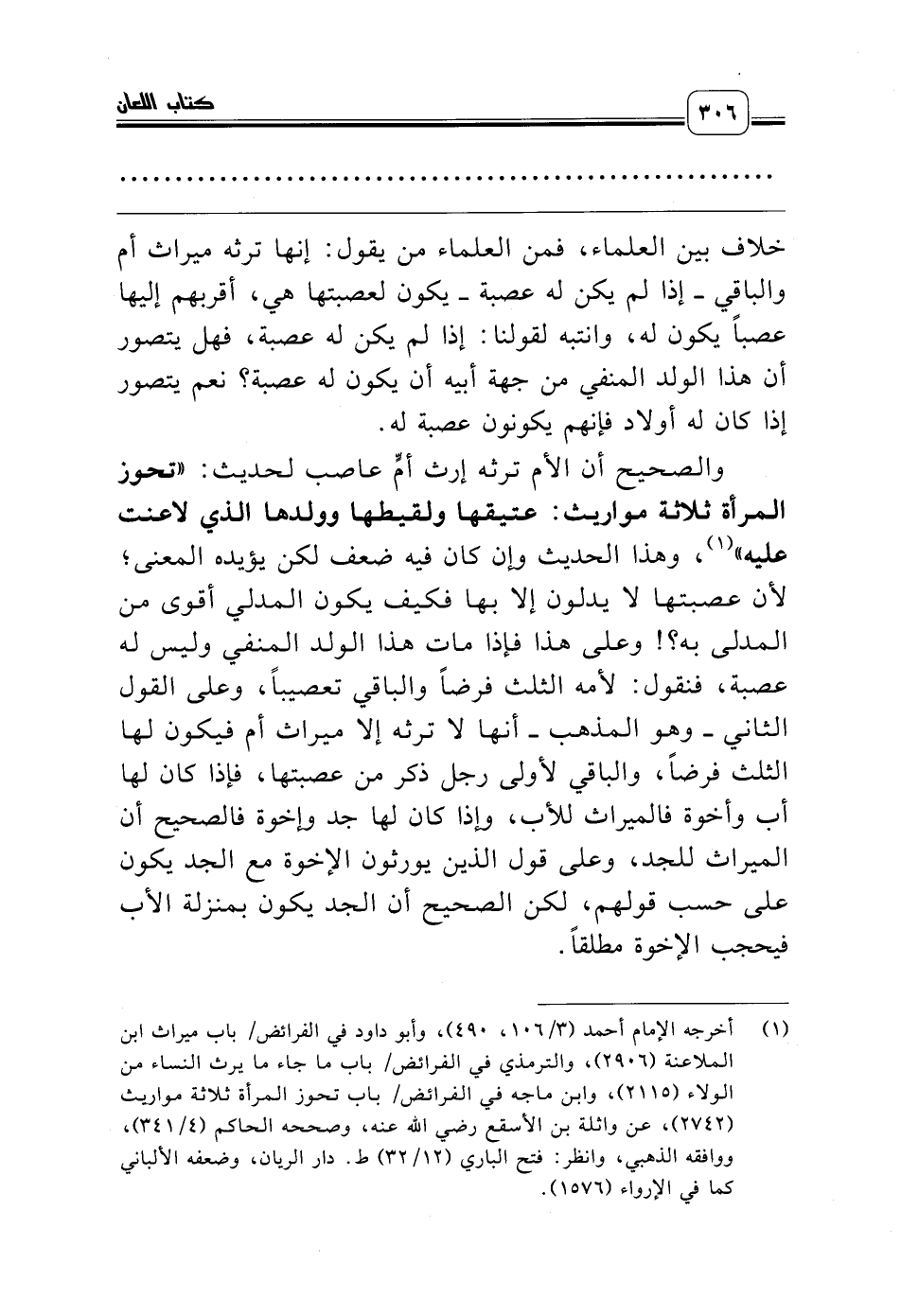 والصحيح أن الأم ترثه إرث أمٍّ عاصب لحديث: «تحوز المرأة ثلاثة مواريث: عتيقها ولقيطها وولدها الذي لاعنت عليه» (¬1)، وهذا الحديث وإن كان فيه ضعف لكن يؤيده المعنى؛ لأن عصبتها لا يدلون إلا بها فكيف يكون المدلي أقوى من المدلى به؟! وعلى هذا فإذا مات هذا الولد المنفي وليس له عصبة، فنقول: لأمه الثلث فرضاً والباقي تعصيباً، وعلى القول الثاني ـ وهو المذهب ـ أنها لا ترثه إلا ميراث أم فيكون لها الثلث فرضاً، والباقي لأولى رجل ذكر من عصبتها، فإذا كان لها أب وأخوة فالميراث للأب، وإذا كان لها جد وإخوة فالصحيح أن الميراث للجد، وعلى قول الذين يورثون الإخوة مع الجد يكون على حسب قولهم، لكن الصحيح أن الجد يكون بمنزلة الأب فيحجب الإخوة مطلقاً.