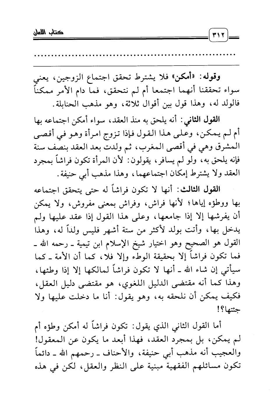 القول الثالث: أنها لا تكون فراشاً له حتى يتحقق اجتماعه بها ووطؤه إياها؛ لأنها فراش، وفراش بمعنى مفروش، ولا يمكن أن يفرشها إلا إذا جامعها، وعلى هذا القول إذا عقد عليها ولم يدخل بها، وأتت بولد لأكثر من ستة أشهر فليس ولداً له، وهذا القول هو الصحيح وهو اختيار شيخ الإسلام ابن تيمية ـ رحمه الله ـ فما تكون فراشاً إلا بحقيقة الوطء وإلا فلا، كما أن الأمة ـ كما سيأتي إن شاء الله ـ أنها لا تكون فراشاً لمالكها إلا إذا وطئها، وهذا كما أنه مقتضى الدليل اللغوي، هو مقتضى دليل العقل، فكيف يمكن أن نلحقه به، وهو يقول: أنا ما دخلت عليها ولا جئتها؟!