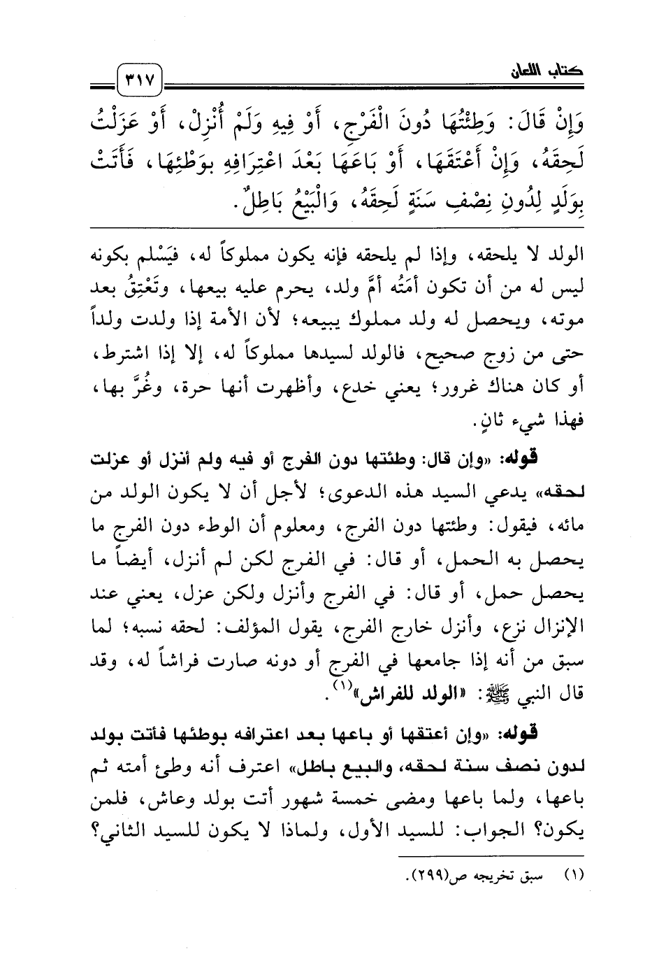 قوله: «وإن أعتقها أو باعها بعد اعترافه بوطئها فأتت بولد لدون نصف سنة لحقه، والبيع باطل» اعترف أنه وطئ أمته ثم باعها، ولما باعها ومضى خمسة شهور أتت بولد وعاش، فلمن يكون؟ الجواب: للسيد الأول، ولماذا لا يكون للسيد الثاني؟