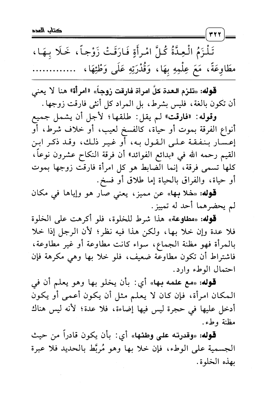 تَلْزَمُ الْعِدَّةُ كُلَّ امْرأَةٍ فَارَقَتْ زَوْجاً، خَلاَ بِهَا، مطَاوِعَةً، مَعَ عِلْمِهِ بِهَا، وَقُدْرَتِهِ عَلَى وَطْئِهَا، وَلَوْ مَعَ مَا يَمْنَعُهُ مِنْهُمَا، أَوْ مِنْ أَحَدِهِمَا حِسّاً، أَوْ شَرْعاً، أَوْ وَطِئَهَا، أَوْ مَاتَ عَنْهَا ......