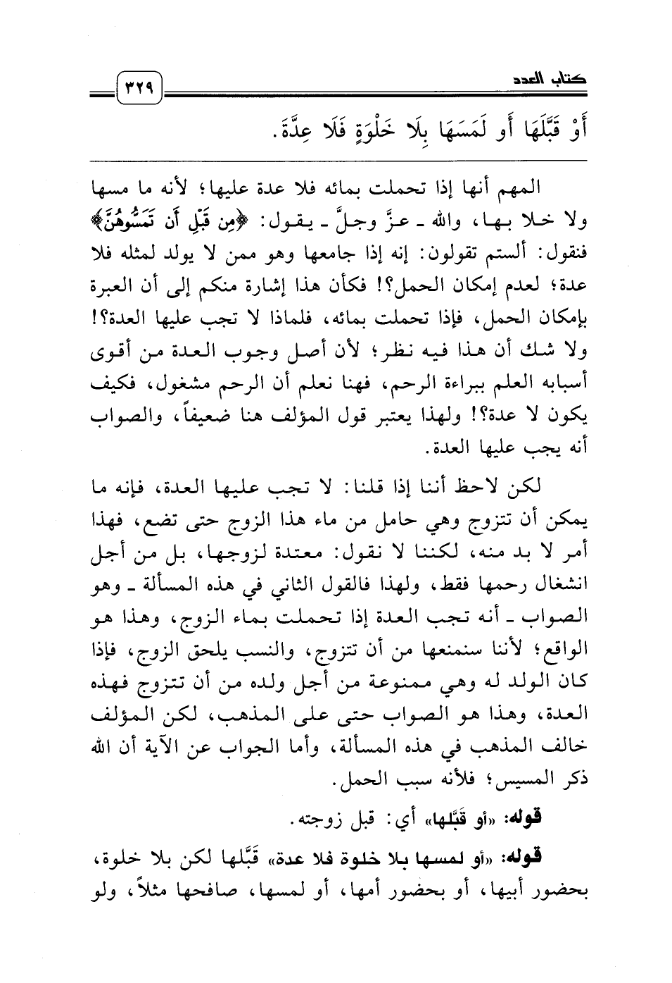 لكن لاحظ أننا إذا قلنا: لا تجب عليها العدة، فإنه ما يمكن أن تتزوج وهي حامل من ماء هذا الزوج حتى تضع، فهذا أمر لا بد منه، لكننا لا نقول: معتدة لزوجها، بل من أجل انشغال رحمها فقط، ولهذا فالقول الثاني في هذه المسألة ـ وهو الصواب ـ أنه تجب العدة إذا تحملت بماء الزوج، وهذا هو الواقع؛ لأننا سنمنعها من أن تتزوج، والنسب يلحق الزوج، فإذا كان الولد له وهي ممنوعة من أجل ولده من أن تتزوج فهذه العدة، وهذا هو الصواب حتى على المذهب، لكن المؤلف خالف المذهب في هذه المسألة، وأما الجواب عن الآية أن الله ذكر المسيس؛ فلأنه سبب الحمل.