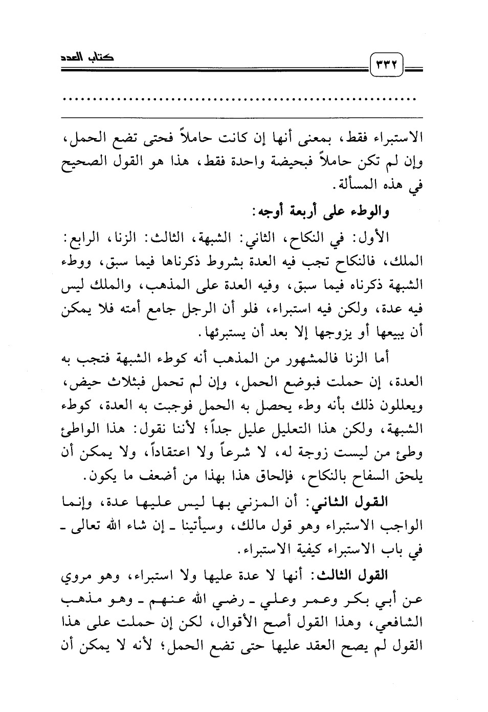 الأول: في النكاح، الثاني: الشبهة، الثالث: الزنا، الرابع: الملك، فالنكاح تجب فيه العدة بشروط ذكرناها فيما سبق، ووطء الشبهة ذكرناه فيما سبق، وفيه العدة على المذهب، والملك ليس فيه عدة، ولكن فيه استبراء، فلو أن الرجل جامع أمته فلا يمكن أن يبيعها أو يزوجها إلا بعد أن يستبرئها.