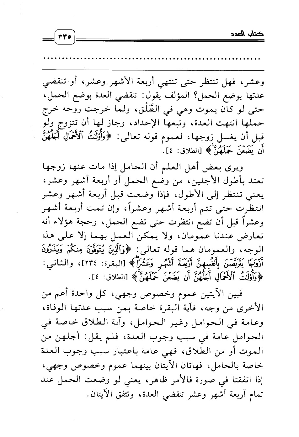 فبين الآيتين عموم وخصوص وجهي، كل واحدة أعم من الأخرى من وجه، فآية البقرة خاصة بمن سبب عدتها الوفاة، وعامة في الحوامل وغير الحوامل، وآية الطلاق خاصة في الحوامل عامة في سبب وجوب العدة، فلم يقل: أجلهن من الموت أو من الطلاق، فهي عامة باعتبار سبب وجوب العدة خاصة بالحامل، فهاتان الآيتان بينهما عموم وخصوص وجهي، إذا اتفقتا في صورة فالأمر ظاهر، يعني لو وضعت الحمل عند تمام أربعة أشهر وعشر تنقضي العدة، وتتفق الآيتان.