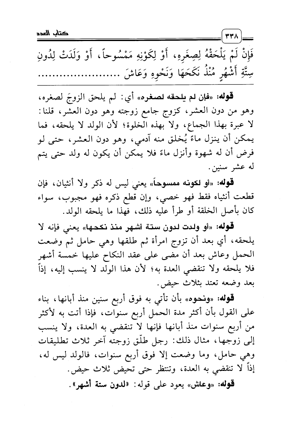 فَإِنْ لَمْ يَلْحَقْهُ لِصِغَرِهِ، أَوْ لِكَوْنِهِ مَمْسُوحاً، أَوْ وَلَدَتْ لِدُونِ سِتَّةِ أَشْهُرٍ مُنْذُ نَكَحَهَا وَنَحْوِهِ وَعَاشَ لَمْ تَنْقَضِ بِهِ، وَأَكْثَرُ مُدَّةِ الْحَمْلِ أَرْبَعُ سِنِينَ، وَأَقَلُّهَا سِتَّةُ أَشْهُرٍ، وَغَالِبُهَا تِسْعَةُ أَشْهُرٍ، وَيُبَاحُ إِلْقَاءُ النُّطْفَةِ قَبْلَ أَرْبَعِينَ يَوْماً بِدَوَاءٍ مُبَاحٍ.