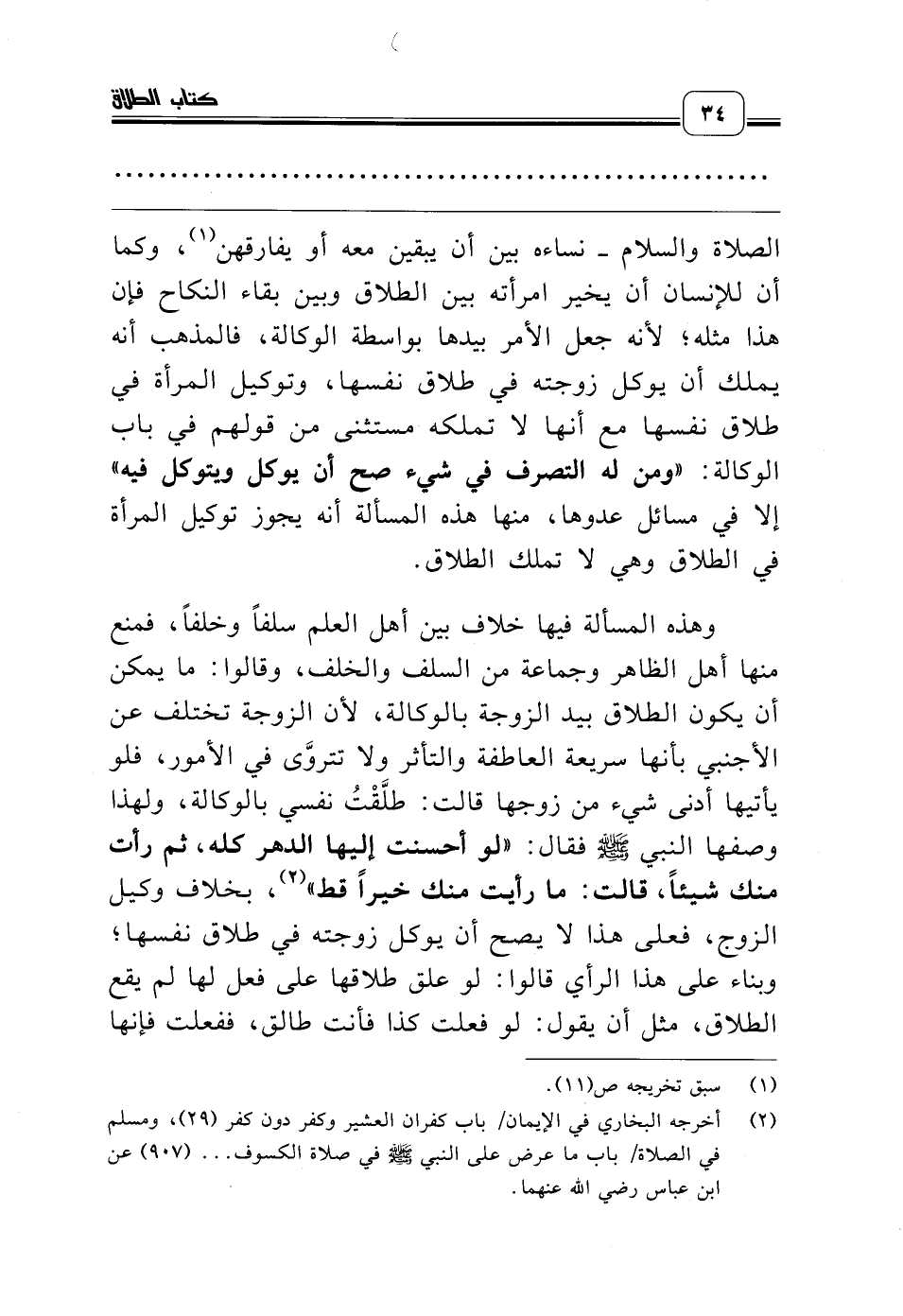 الصلاة والسلام ـ نساءه بين أن يبقين معه أو يفارقهن (¬1)، وكما أن للإنسان أن يخير امرأته بين الطلاق وبين بقاء النكاح فإن هذا مثله؛ لأنه جعل الأمر بيدها بواسطة الوكالة، فالمذهب أنه يملك أن يوكل زوجته في طلاق نفسها، وتوكيل المرأة في طلاق نفسها مع أنها لا تملكه مستثنى من قولهم في باب الوكالة: «ومن له التصرف في شيء صح أن يوكل ويتوكل فيه» إلا في مسائل عدوها، منها هذه المسألة أنه يجوز توكيل المرأة في الطلاق وهي لا تملك الطلاق.