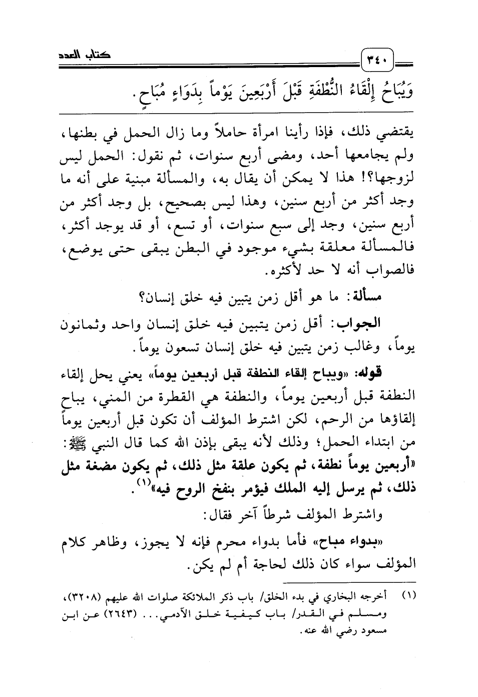 قوله: «ويباح إلقاء النطفة قبل أربعين يوماً» يعني يحل إلقاء النطفة قبل أربعين يوماً، والنطفة هي القطرة من المني، يباح إلقاؤها من الرحم، لكن اشترط المؤلف أن تكون قبل أربعين يوماً من ابتداء الحمل؛ وذلك لأنه يبقى بإذن الله كما قال النبي صلّى الله عليه وسلّم: «أربعين يوماً نطفة، ثم يكون علقة مثل ذلك، ثم يكون مضغة مثل ذلك، ثم يرسل إليه الملك فيؤمر بنفخ الروح فيه» (¬1).