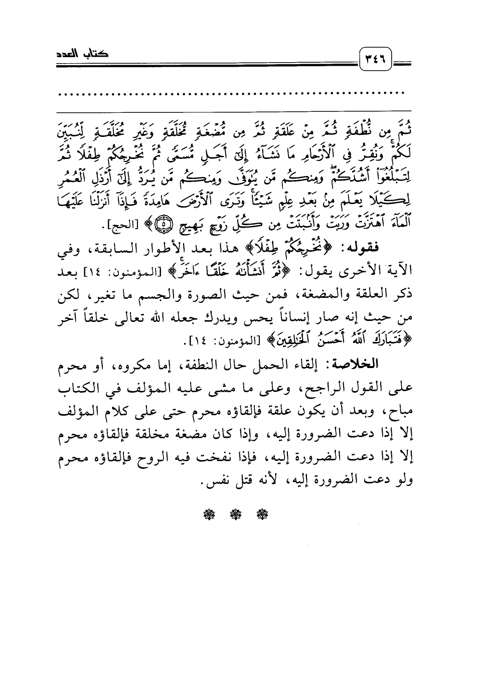 الخلاصة: إلقاء الحمل حال النطفة، إما مكروه، أو محرم على القول الراجح، وعلى ما مشى عليه المؤلف في الكتاب مباح، وبعد أن يكون علقة فإلقاؤه محرم حتى على كلام المؤلف إلا إذا دعت الضرورة إليه، وإذا كان مضغة مخلقة فإلقاؤه محرم إلا إذا دعت الضرورة إليه، فإذا نفخت فيه الروح فإلقاؤه محرم ولو دعت الضرورة إليه، لأنه قتل نفس.
