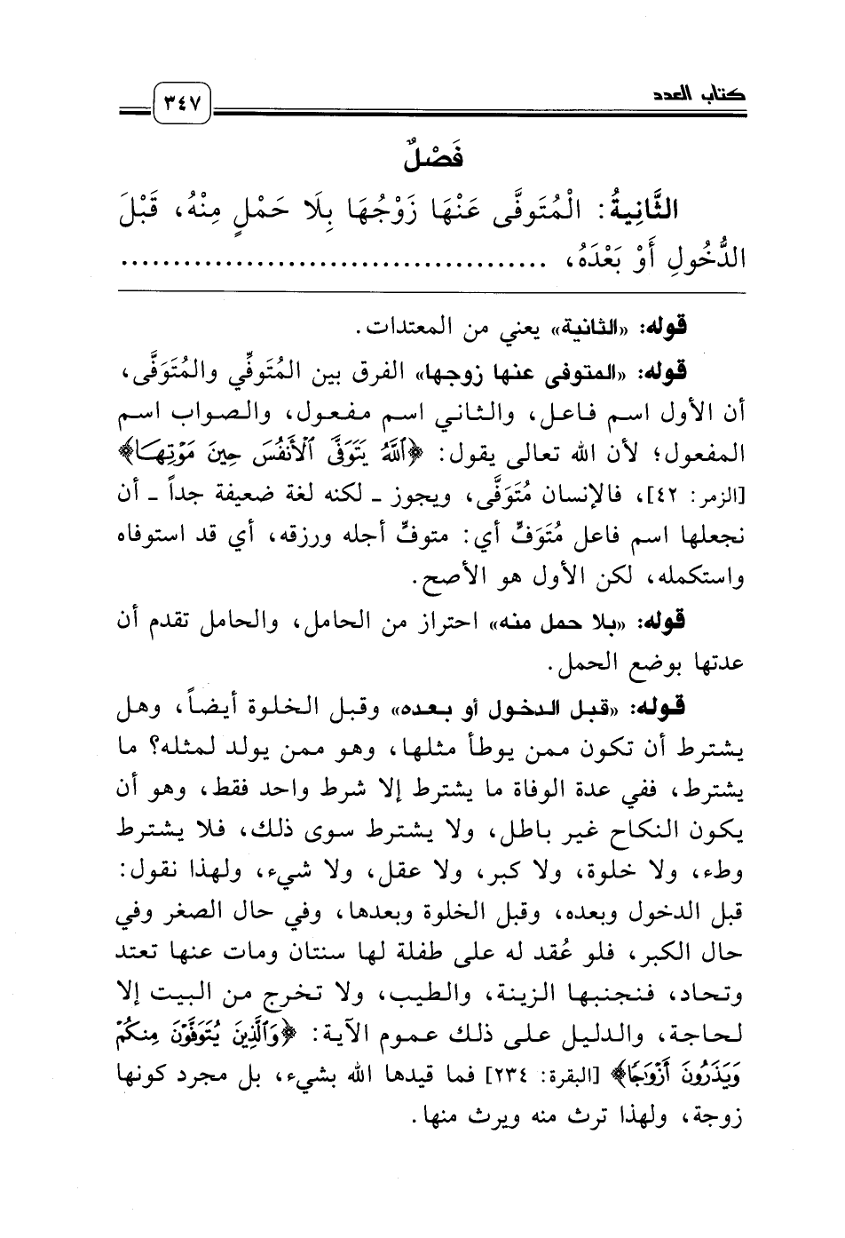 قوله: «المتوفى عنها زوجها» الفرق بين المُتَوفِّي والمُتَوَفَّى، أن الأول اسم فاعل، والثاني اسم مفعول، والصواب اسم المفعول؛ لأن الله تعالى يقول: {اللَّهُ يَتَوَفَّى الأَنْفُسَ حِينَ مَوْتِهَا} [الزمر: 42]، فالإنسان مُتَوَفَّى، ويجوز ـ لكنه لغة ضعيفة جداً ـ أن نجعلها اسم فاعل مُتَوَفٍّ أي: متوفٍّ أجله ورزقه، أي قد استوفاه واستكمله، لكن الأول هو الأصح.
