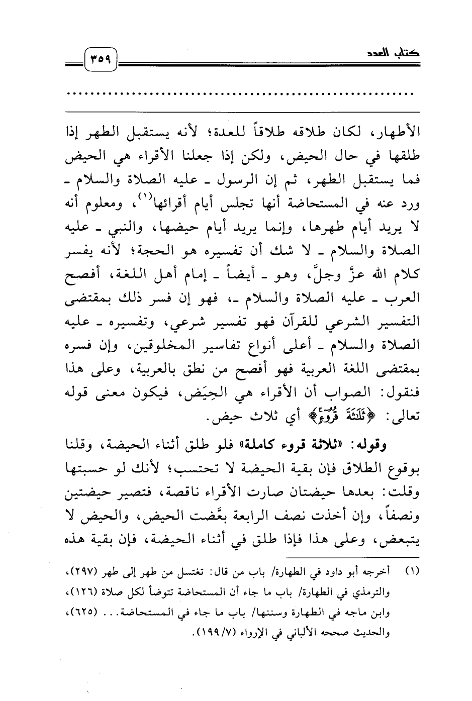 الأطهار، لكان طلاقه طلاقاً للعدة؛ لأنه يستقبل الطهر إذا طلقها في حال الحيض، ولكن إذا جعلنا الأقراء هي الحيض فما يستقبل الطهر، ثم إن الرسول ـ عليه الصلاة والسلام ـ ورد عنه في المستحاضة أنها تجلس أيام أقرائها (¬1)، ومعلوم أنه لا يريد أيام طهرها، وإنما يريد أيام حيضها، والنبي ـ عليه الصلاة والسلام ـ لا شك أن تفسيره هو الحجة؛ لأنه يفسر كلام الله عزّ وجل، وهو ـ أيضاً ـ إمام أهل اللغة، أفصح العرب ـ عليه الصلاة والسلام ـ، فهو إن فسر ذلك بمقتضى التفسير الشرعي للقرآن فهو تفسير شرعي، وتفسيره ـ عليه الصلاة والسلام ـ أعلى أنواع تفاسير المخلوقين، وإن فسره بمقتضى اللغة العربية فهو أفصح من نطق بالعربية، وعلى هذا فنقول: الصواب أن الأقراء هي الحِيَض، فيكون معنى قوله تعالى: {ثَلاَثَةَ قُرُوءٍ} أي ثلاث حيض.