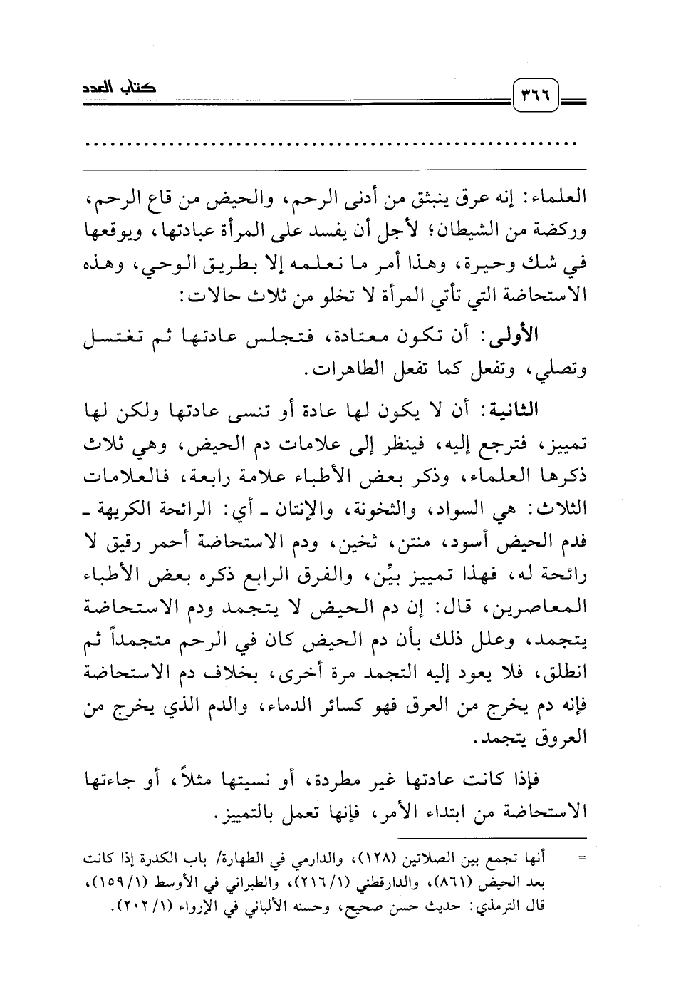 العلماء: إنه عرق ينبثق من أدنى الرحم، والحيض من قاع الرحم، وركضة من الشيطان؛ لأجل أن يفسد على المرأة عبادتها، ويوقعها في شك وحيرة، وهذا أمر ما نعلمه إلا بطريق الوحي، وهذه الاستحاضة التي تأتي المرأة لا تخلو من ثلاث حالات:
