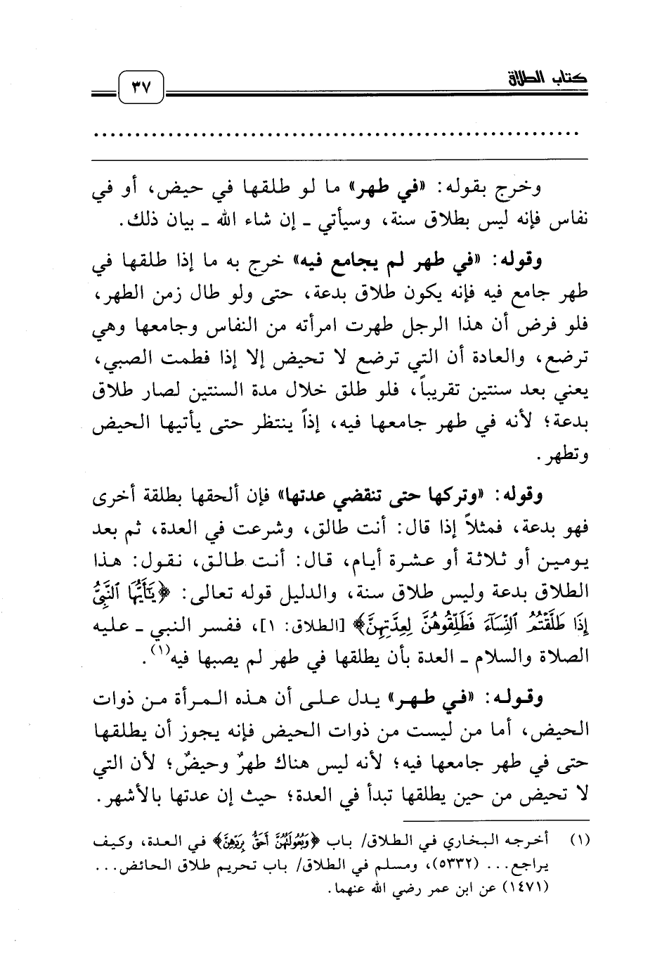 وقوله: «وتركها حتى تنقضي عدتها» فإن ألحقها بطلقة أخرى فهو بدعة، فمثلاً إذا قال: أنت طالق، وشرعت في العدة، ثم بعد يومين أو ثلاثة أو عشرة أيام، قال: أنت طالق، نقول: هذا الطلاق بدعة وليس طلاق سنة، والدليل قوله تعالى: {يَاأَيُّهَا النَّبِيُّ إِذَا طَلَّقْتُمُ النِّسَاءَ فَطَلِّقُوهُنَّ لِعِدَّتِهِنَّ} [الطلاق: 1]، ففسر النبي ـ عليه الصلاة والسلام ـ العدة بأن يطلقها في طهر لم يصبها فيه (¬1).