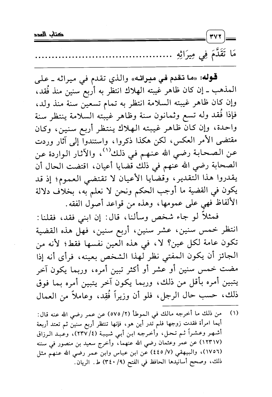 قوله: «ما تقدم في ميراثه» والذي تقدم في ميراثه ـ على المذهب ـ إن كان ظاهر غيبته الهلاك انتظر به أربع سنين منذ فُقد، وإن كان ظاهر غيبته السلامة انتظر به تمام تسعين سنة منذ ولد، فإذا فُقد وله تسع وثمانون سنة وظاهر غيبته السلامة ينتظر سنة واحدة، وإن كان ظاهر غيبته الهلاك ينتظر أربع سنين، وكان مقتضى الأمر العكس، لكن هكذا ذكروا، واستندوا إلى آثار وردت عن الصحابة رضي الله عنهم في ذلك (¬1)، والآثار الواردة عن الصحابة رضي الله عنهم في ذلك قضايا أعيان، اقتضت الحال أن يقدروا هذا التقدير، وقضايا الأعيان لا تقتضي العموم؛ إذ قد يكون في القضية ما أوجب الحكم ونحن لا نعلم به، بخلاف دلالة الألفاظ فهي على عمومها، وهذه من قواعد أصول الفقه.