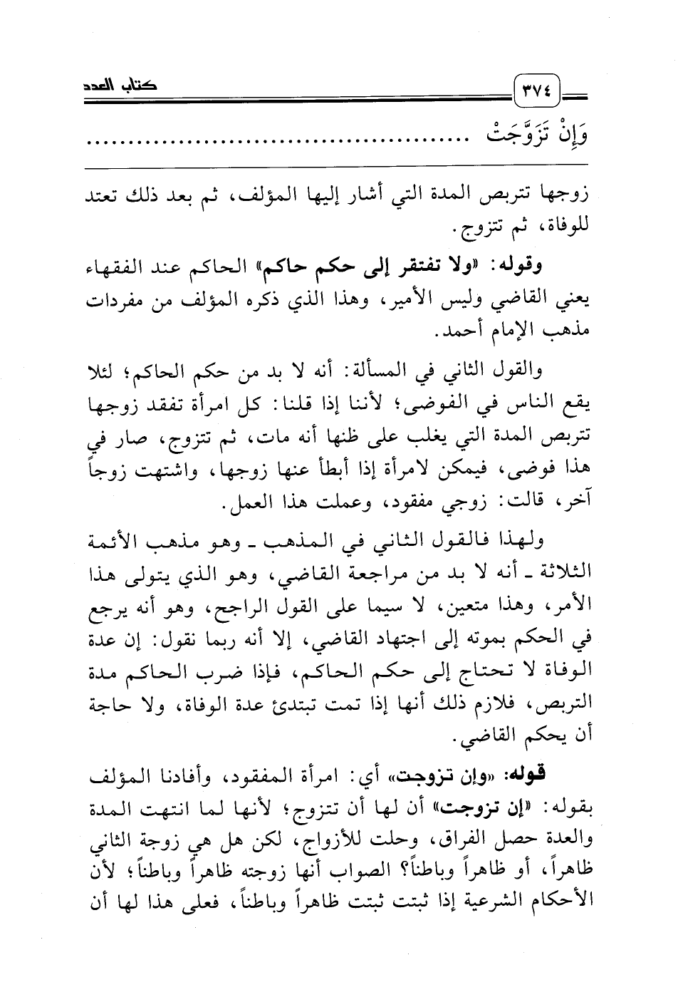 ولهذا فالقول الثاني في المذهب ـ وهو مذهب الأئمة الثلاثة ـ أنه لا بد من مراجعة القاضي، وهو الذي يتولى هذا الأمر، وهذا متعين، لا سيما على القول الراجح، وهو أنه يرجع في الحكم بموته إلى اجتهاد القاضي، إلا أنه ربما نقول: إن عدة الوفاة لا تحتاج إلى حكم الحاكم، فإذا ضرب الحاكم مدة التربص، فلازم ذلك أنها إذا تمت تبتدئ عدة الوفاة، ولا حاجة أن يحكم القاضي.
