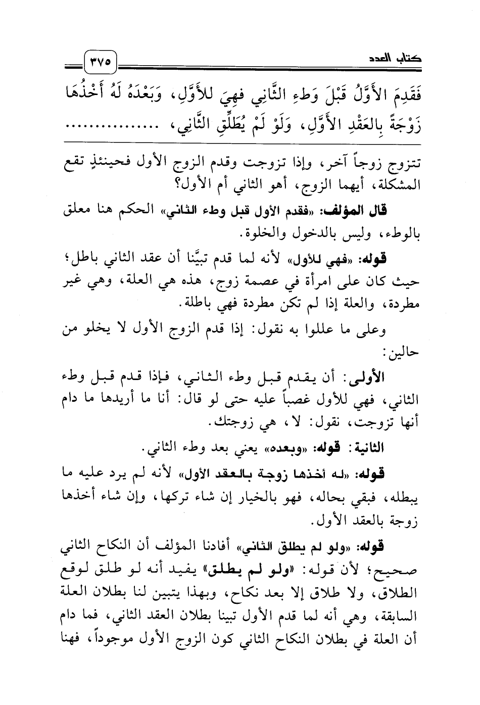 قوله: «فهي للأول» لأنه لما قدم تبيَّنا أن عقد الثاني باطل؛ حيث كان على امرأة في عصمة زوج، هذه هي العلة، وهي غير مطردة، والعلة إذا لم تكن مطردة فهي باطلة.