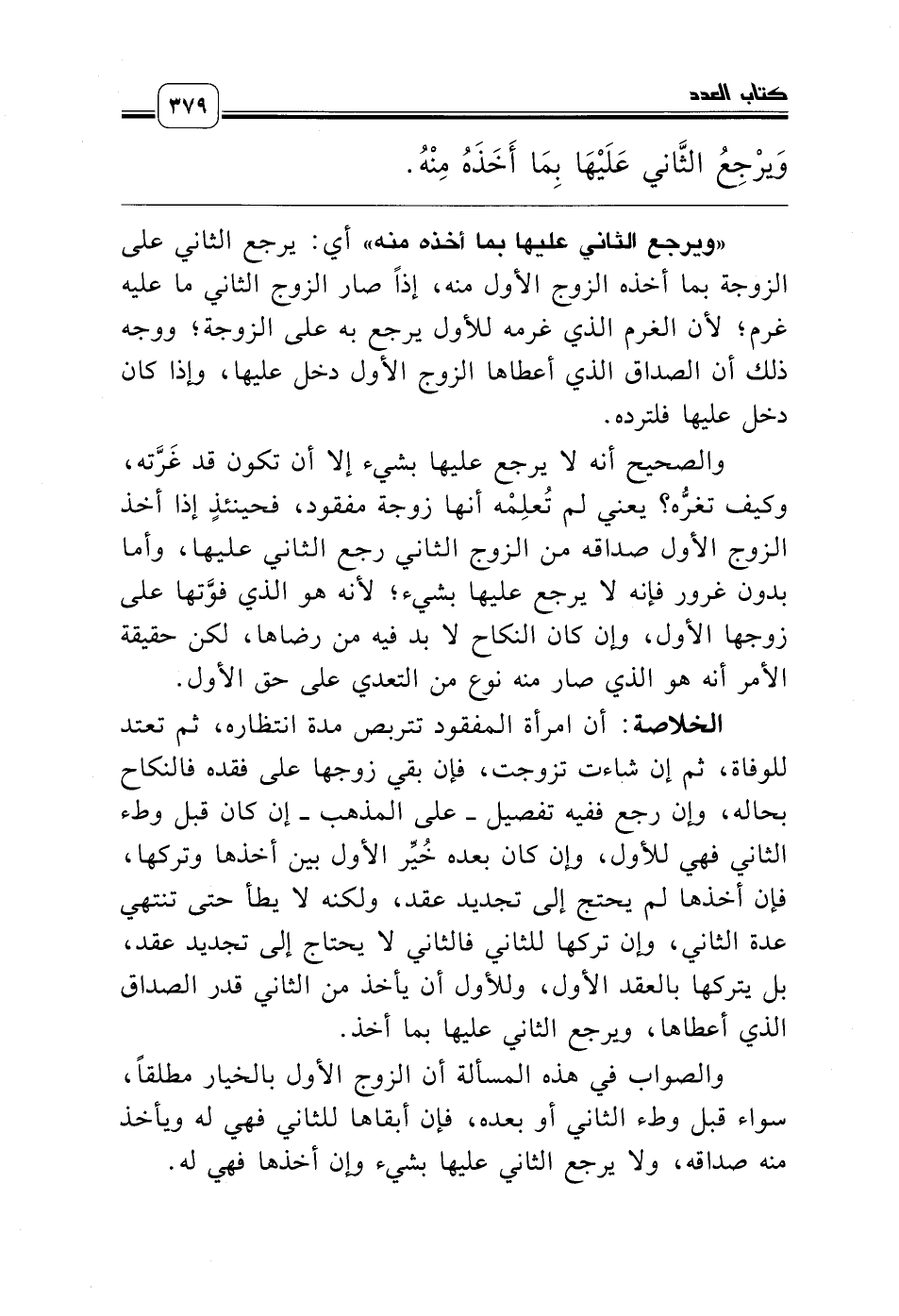 الخلاصة: أن امرأة المفقود تتربص مدة انتظاره، ثم تعتد للوفاة، ثم إن شاءت تزوجت، فإن بقي زوجها على فقده فالنكاح بحاله، وإن رجع ففيه تفصيل ـ على المذهب ـ إن كان قبل وطء الثاني فهي للأول، وإن كان بعده خُيِّر الأول بين أخذها وتركها، فإن أخذها لم يحتج إلى تجديد عقد، ولكنه لا يطأ حتى تنتهي عدة الثاني، وإن تركها للثاني فالثاني لا يحتاج إلى تجديد عقد، بل يتركها بالعقد الأول، وللأول أن يأخذ من الثاني قدر الصداق الذي أعطاها، ويرجع الثاني عليها بما أخذ.