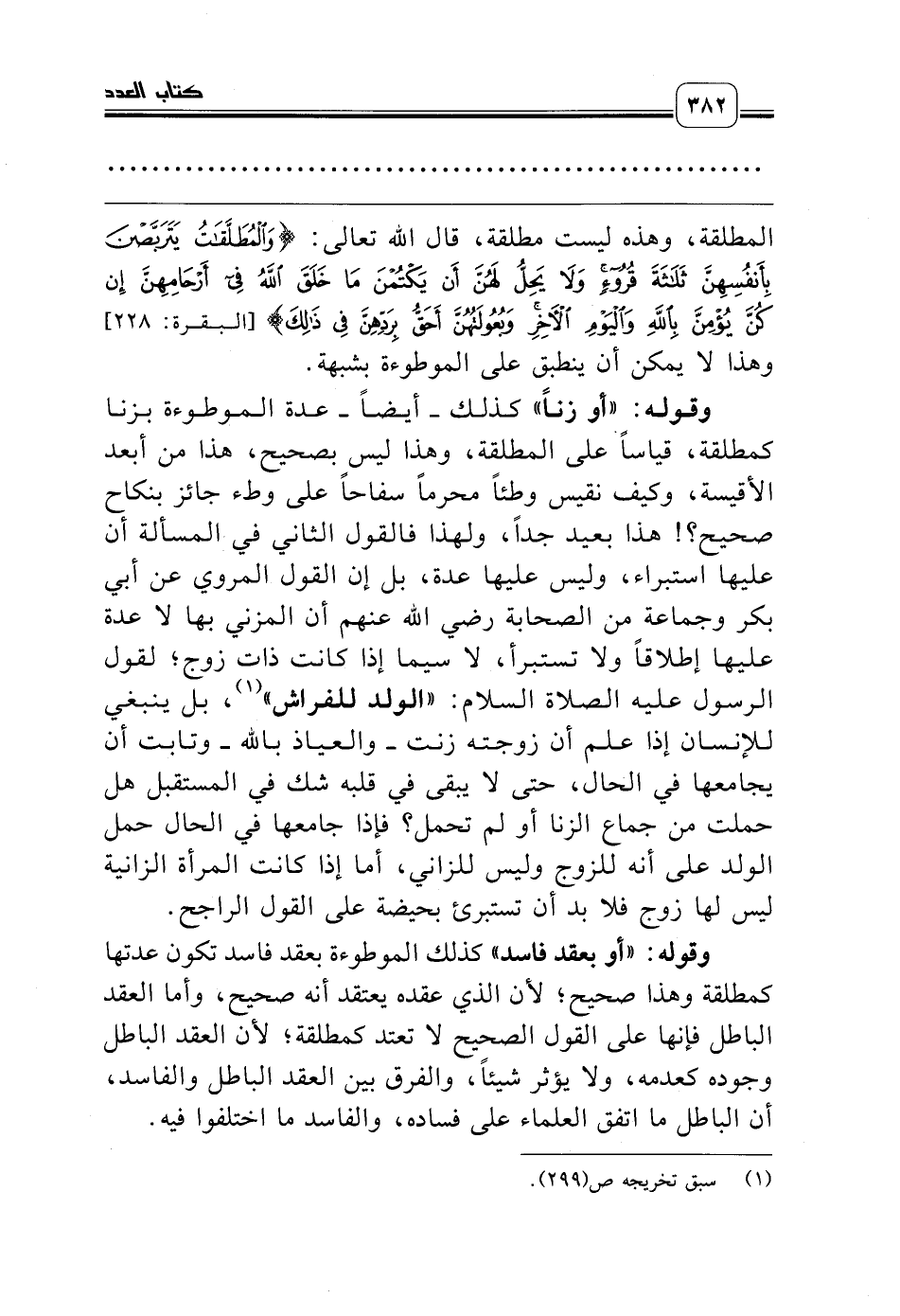 المطلقة، وهذه ليست مطلقة، قال الله تعالى: {وَالْمُطَلَّقَاتُ يَتَرَبَّصْنَ بِأَنْفُسِهِنَّ ثَلاَثَةَ قُرُوءٍ وَلاَ يَحِلُّ لَهُنَّ أَنْ يَكْتُمْنَ مَا خَلَقَ اللَّهُ فِي أَرْحَامِهِنَّ إِنْ كُنَّ يُؤْمِنَّ بِاللَّهِ وَالْيَوْمِ الآخِرِ وَبُعُولَتُهُنَّ أَحَقُّ بِرَدِّهِنَّ فِي ذَلِكَ} [البقرة: 228] وهذا لا يمكن أن ينطبق على الموطوءة بشبهة.