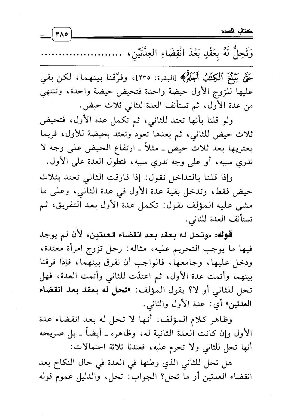 حَتَّى يَبْلُغَ الْكِتَابُ أَجَلَهُ} [البقرة: 235]، وفرَّقنا بينهما، لكن بقي عليها للزوج الأول حيضة واحدة فتحيض حيضة واحدة، وتنتهي من عدة الأول، ثم تستأنف العدة للثاني ثلاث حيض.