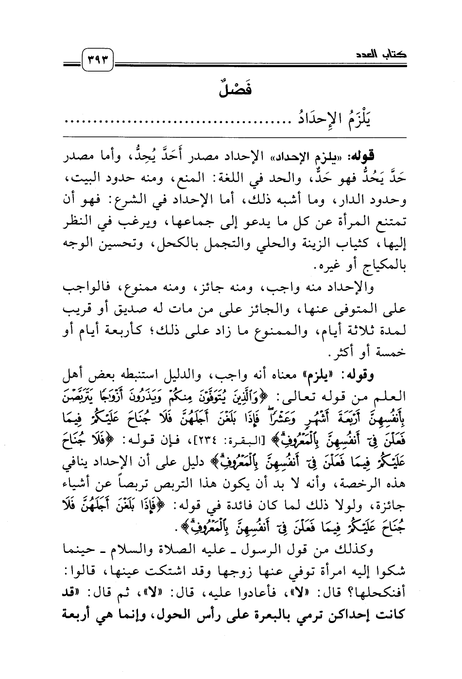 قوله: «يلزم الإحداد» الإحداد مصدر أَحَدَّ يُحِدُّ، وأما مصدر حَدَّ يَحُدُّ فهو حَدٌّ، والحد في اللغة: المنع، ومنه حدود البيت، وحدود الدار، وما أشبه ذلك، أما الإحداد في الشرع: فهو أن تمتنع المرأة عن كل ما يدعو إلى جماعها، ويرغب في النظر إليها، كثياب الزينة والحلي والتجمل بالكحل، وتحسين الوجه بالمكياج أو غيره.