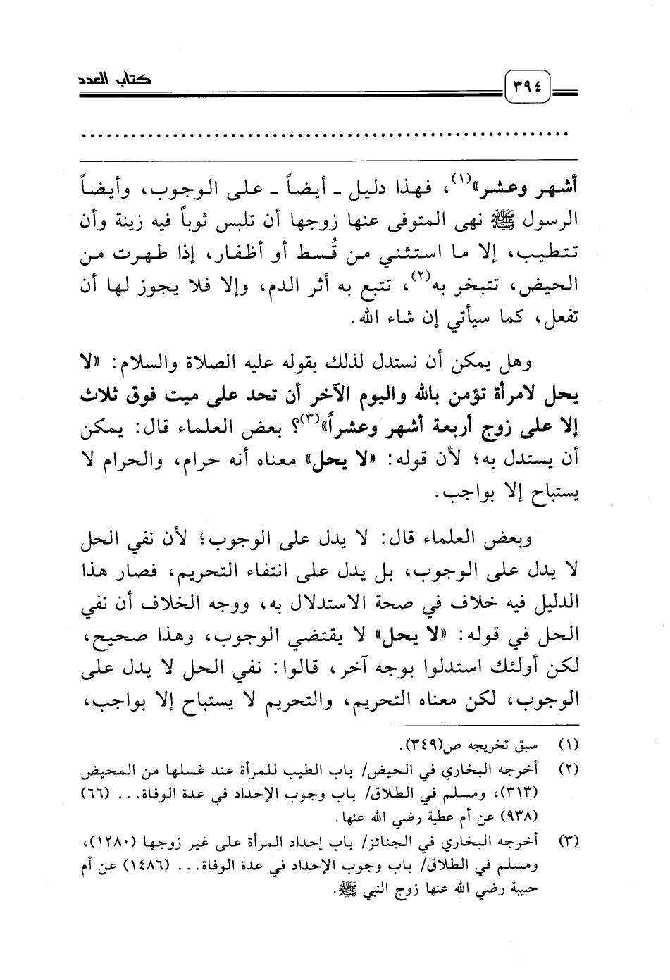 (¬3) أخرجه البخاري في الجنائز/ باب إحداد المرأة على غير زوجها (1280)، ومسلم في الطلاق/ باب وجوب الإحداد في عدة الوفاة ... (1486) عن أم حبيبة رضي الله عنها زوج النبي صلّى الله عليه وسلّم.