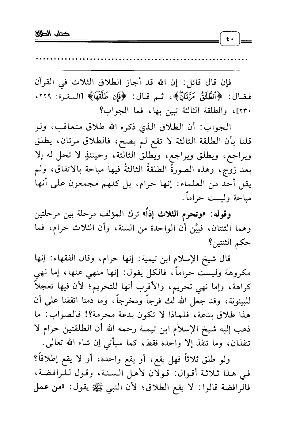 ولو طلق ثلاثاً فهل يقع، أو يقع واحدة، أو لا يقع إطلاقاً؟ في هذا ثلاثة أقوال: قولان لأهل السنة، وقول للرافضة، فالرافضة قالوا: لا يقع الطلاق؛ لأن النبي صلّى الله عليه وسلّم يقول: «من عمل